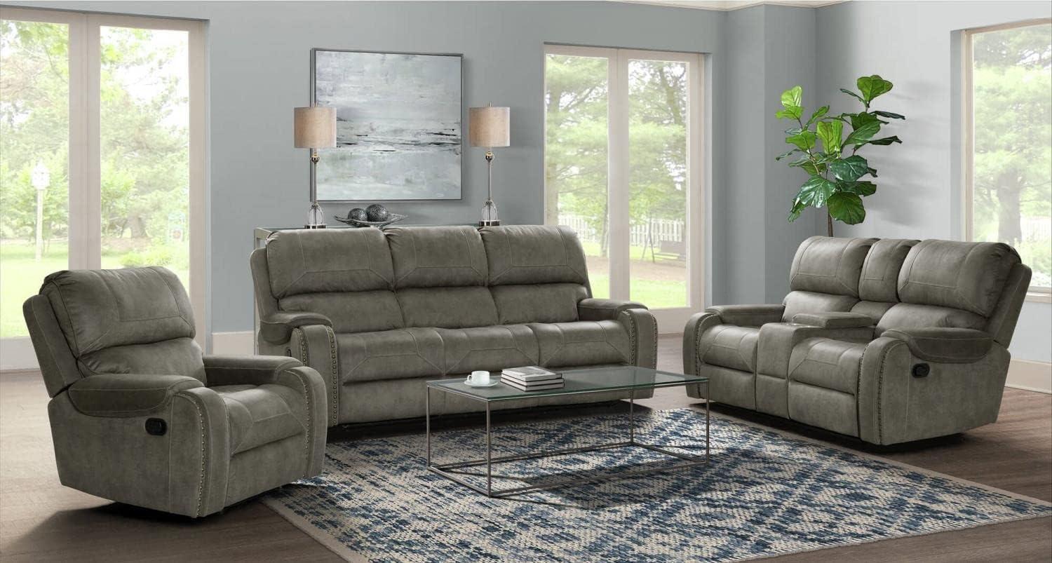 This three-piece reclining set instantly upgrades any family room or home theater with its combination of rustic charm and modern comfort.Featuring gray upholstery accented with striking brass nailheads, the design evokes a cozy yet contemporary ambiance. Each piece-sofa, loveseat, and recliner-is carefully crafted with padded, contoured arms and plush, overstuffed fiber-filled backs that provide superior lumbar and shoulder support. The durable frames are reinforced with kiln-dried pine and furniture-grade plywood, ensuring stability and longevity, while the manual reclining mechanisms smoothly glide on heavy-duty steel rails, offering three recline positions including full lay-flat comfort.