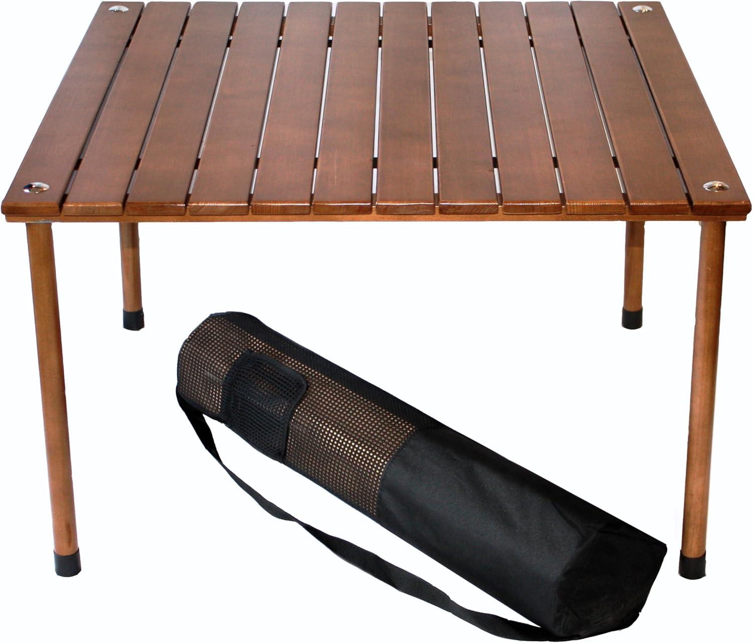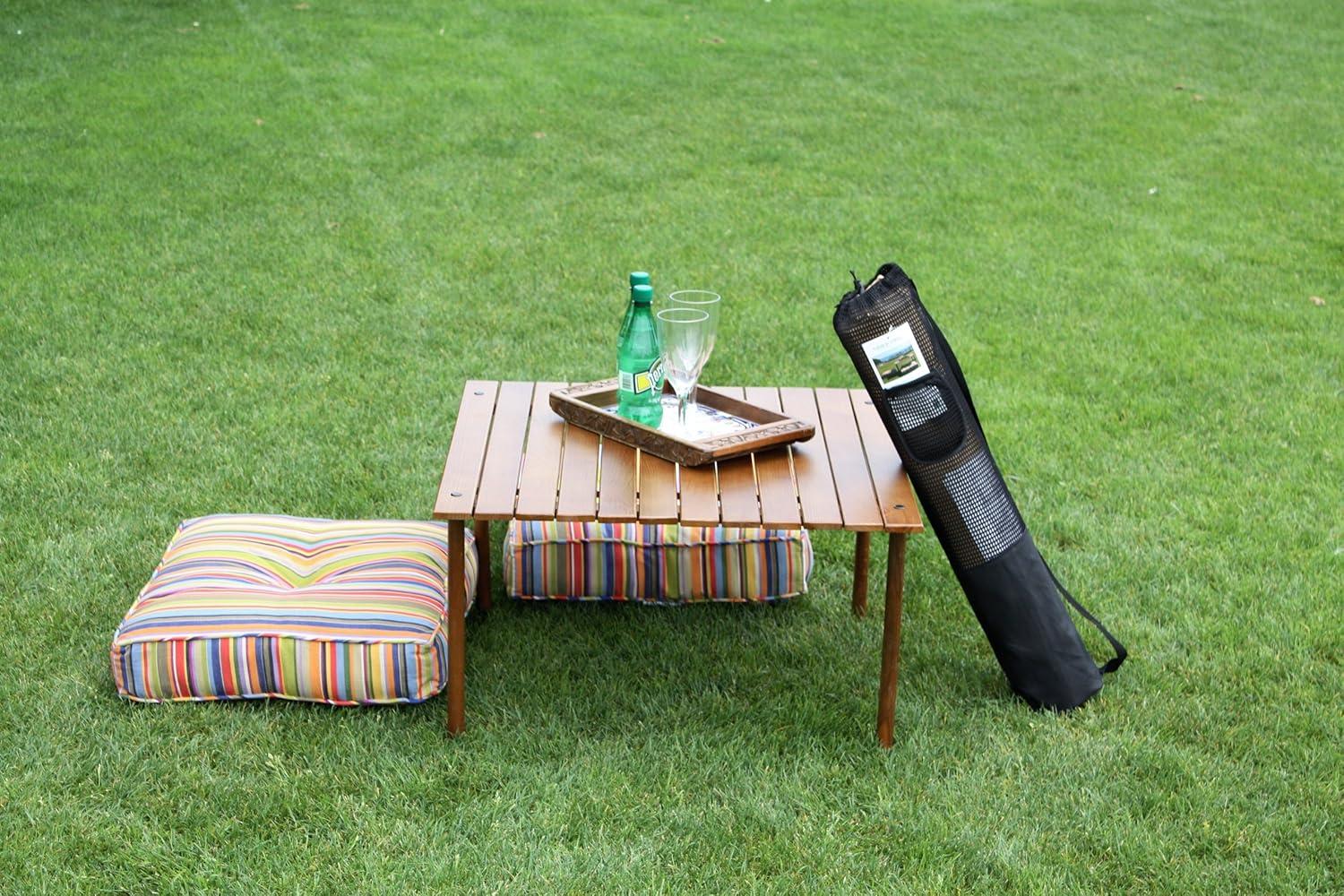 Designed as the ultimate table-on-the-go, this compact and portable table immediately caught our attention with its clever roll-top design and lightweight construction. We found it extremely convenient that every component- from the water-resistant solid hardwood tabletop to the sturdy legs and crossbars- stores neatly inside one sleek black carrying bag. It unfolds into a low-profile 27″ square surface with a height of just 16 inches, making it ideal for use on a beach blanket, at outdoor concerts, or during casual picnics without the need for chairs. The assembly process was surprisingly straightforward thanks to clear, step-by-step instructions, and the table felt impressively stable once set up.