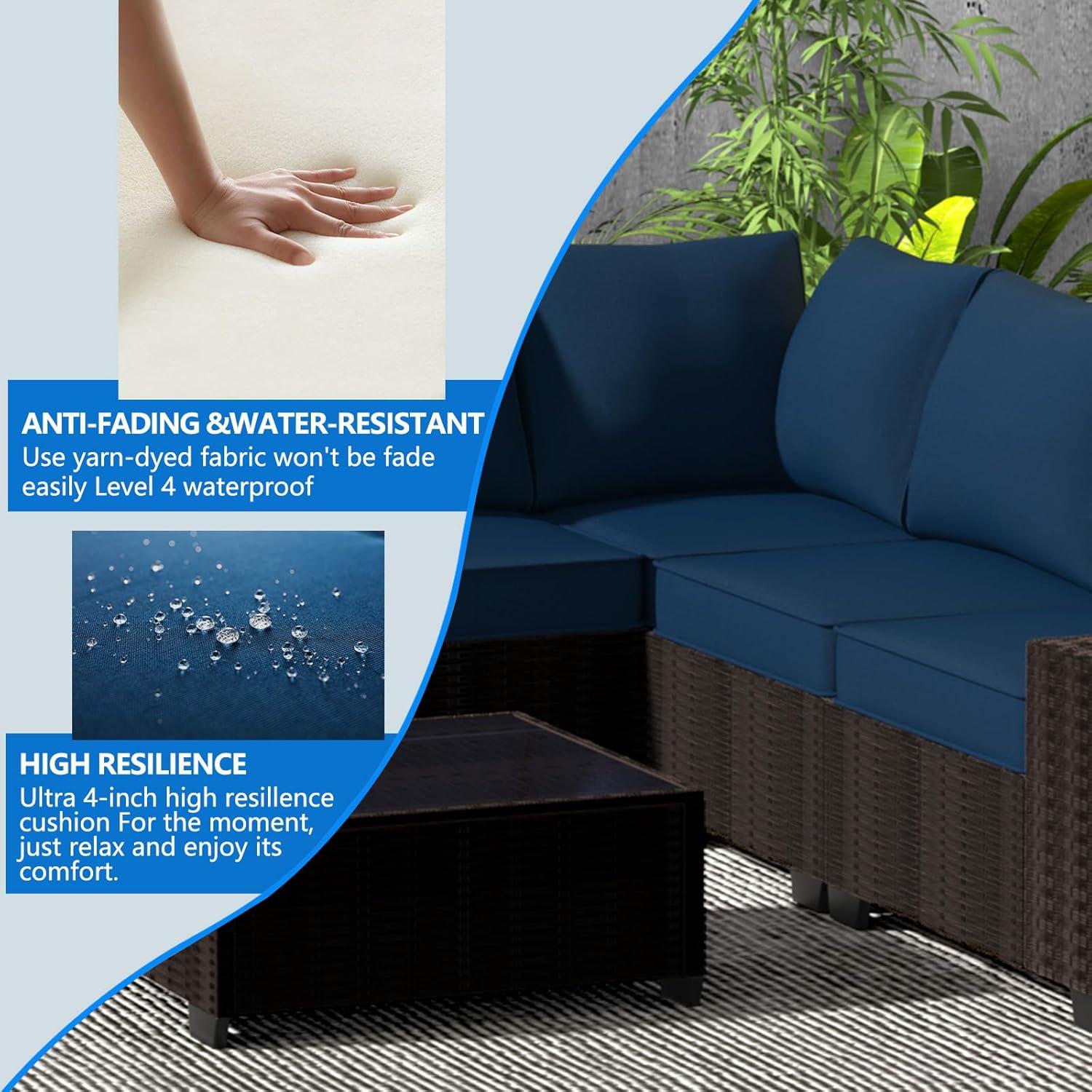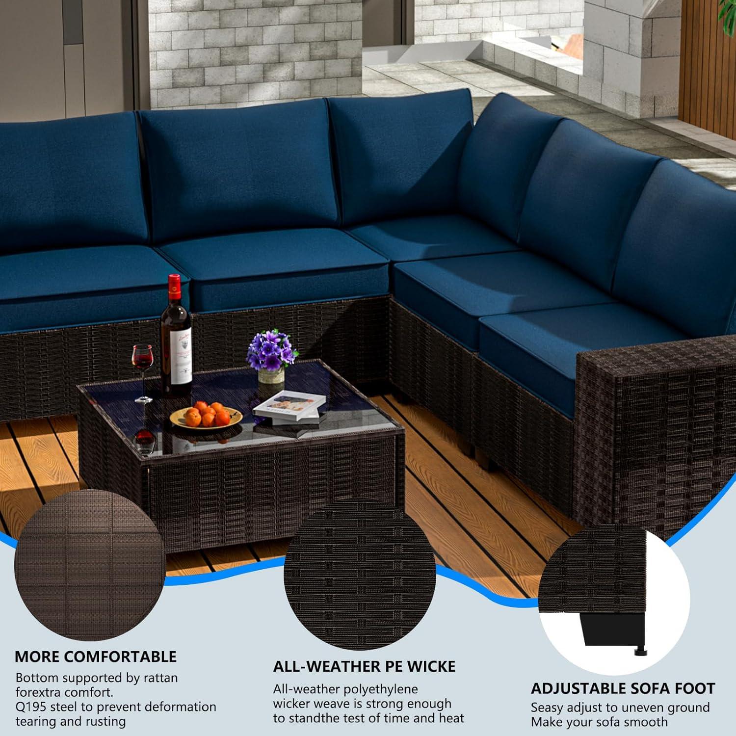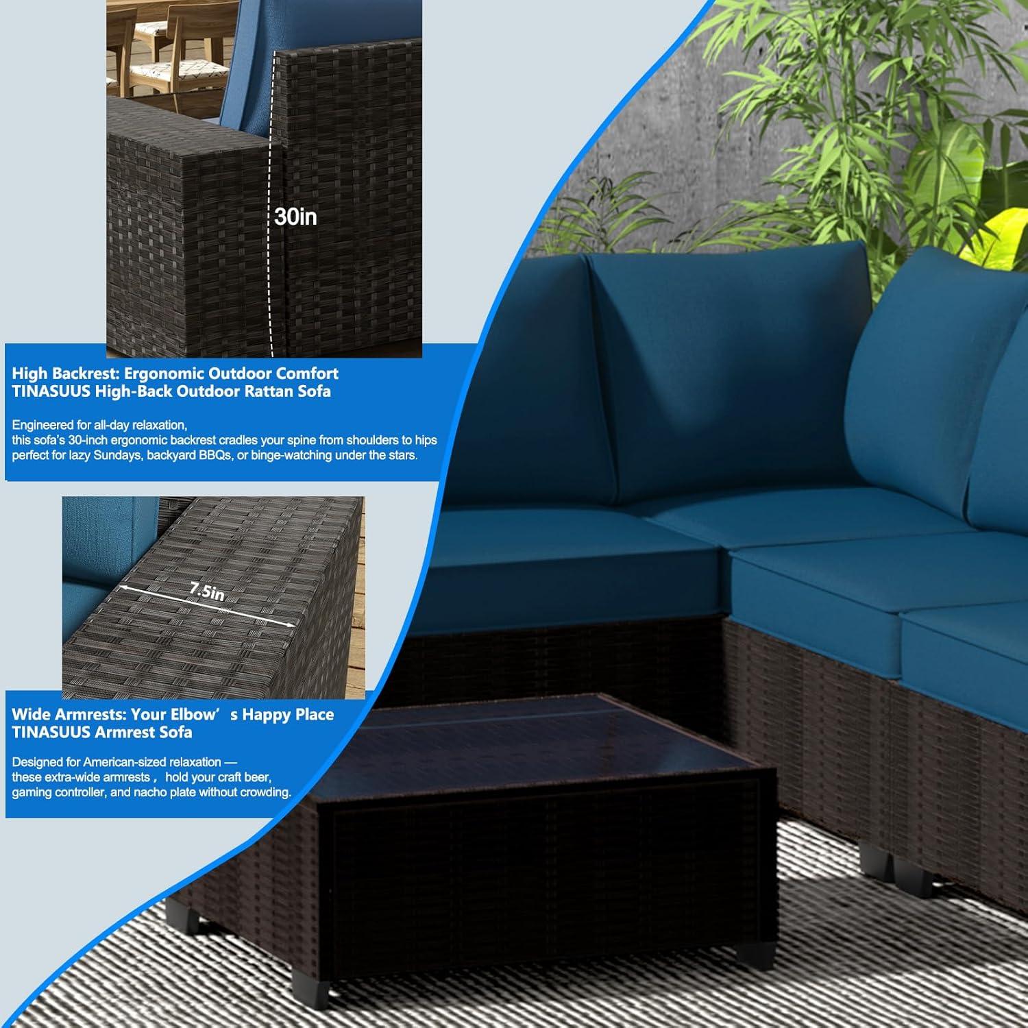 The set’s modular design allows us to effortlessly customize our outdoor living space with an inviting, contemporary look that fits various layouts. Whether arranged in a cozy L-shape for intimate family evenings or broken up into separate seating clusters for lively garden parties, the deep brown rattan weave paired with vibrant peacock blue cushions creates an elegant contrast that naturally elevates any backyard or poolside ambiance. We notably appreciate how the wide armrests add both functional charm and a modern silhouette, doubling as practical surfaces for resting drinks or devices without disrupting the clean lines.