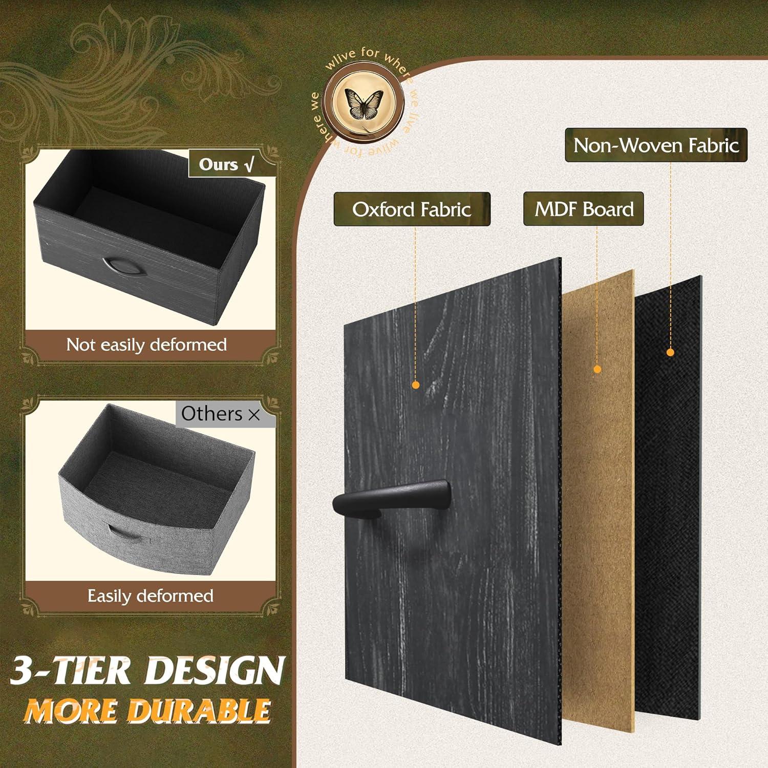 The fabric drawers combine practicality with a stylish, contemporary look that doesn’t compromise on quality. Crafted from three layers of high-quality fiberboard encased in breathable non-woven fabric, these drawers bring a unique softness to the customary chest-of-drawers aesthetic while maintaining structural integrity. Their lightweight nature allows for easy reorganization and handling, especially in smaller living spaces or rooms with limited layout options. The charcoal black wood grain print lends an elegant,natural texture that blends effortlessly with various decor styles,making the piece a versatile addition to bedrooms,living rooms,or even entryways.