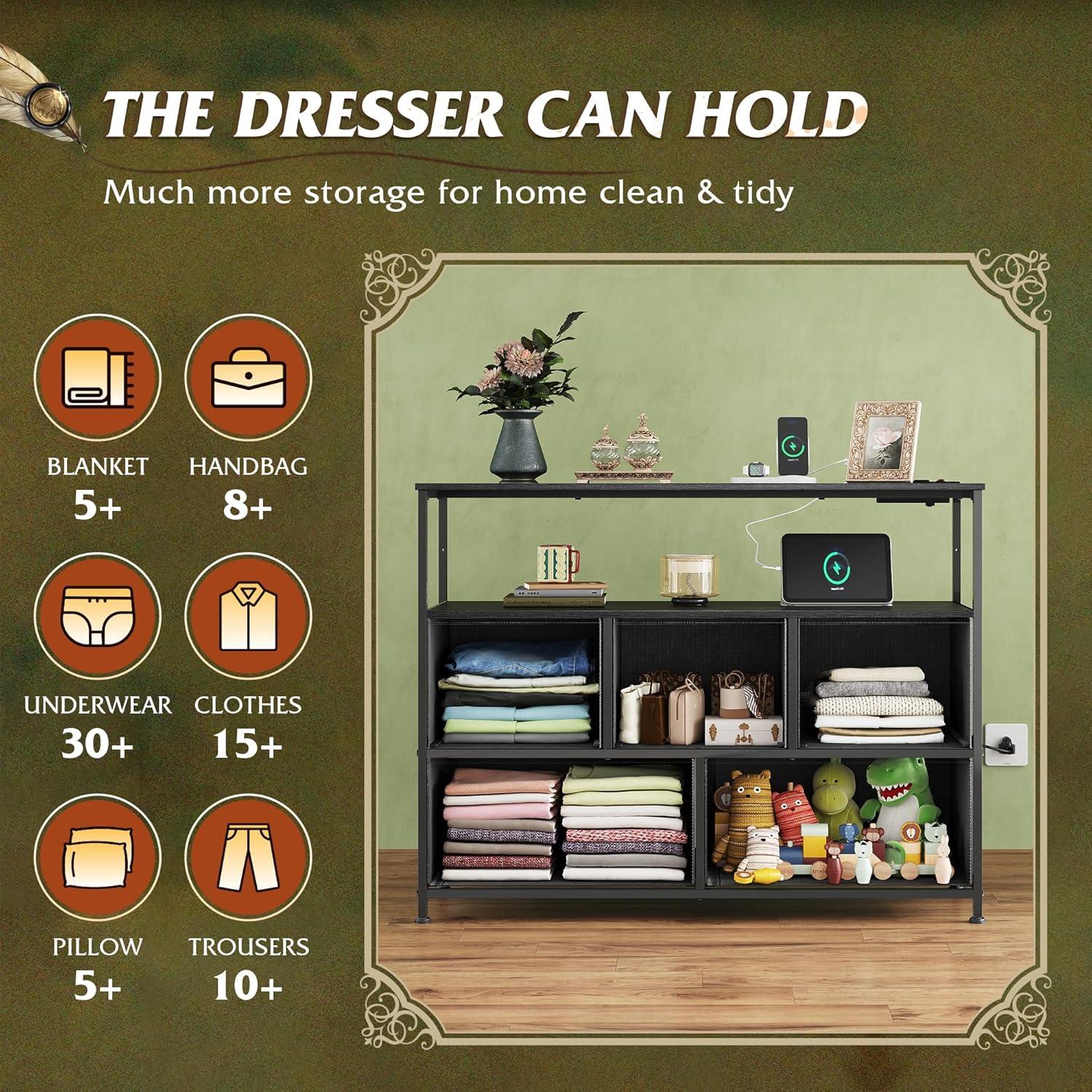Combining practicality with modern aesthetics, this dresser is thoughtfully crafted to bring organized charm to any room. Featuring five spacious fabric drawers alongside open shelving, it offers flexible storage options to neatly accommodate everything from clothing and accessories to entertainment devices. Its top surface is reinforced to hold essentials like a TV or decor items,while the built-in charging station-with three AC sockets-helps us cut down on clutter by powering our gadgets directly from the dresser. The charcoal black wood grain print gives it a sleek yet natural look that fits seamlessly into bedrooms, living rooms, closets, or even entryways.