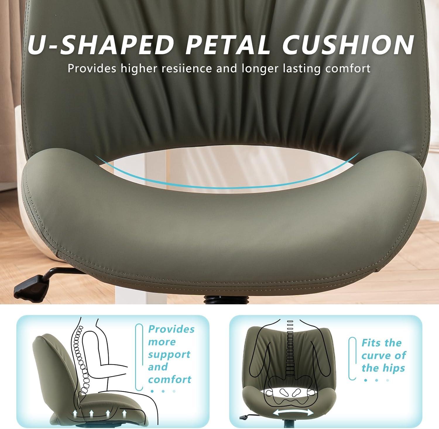From the moment we set up this chair, it was clear that comfort was a priority in its design. The wrap-around backrest with its delicate curvature truly provides cozy support that gently cradles the lower back and sides, making long hours at the desk much more manageable. The high-density sponge cushion deserves special mention – its petal-style padding feels like sitting on a cloud, fully supporting the hips and legs with a breathable, resilient texture. The faux leather upholstery not only looks elegant with its olive green hue but is also soft to the touch and easy to maintain, making it a practical choice for home office environments.