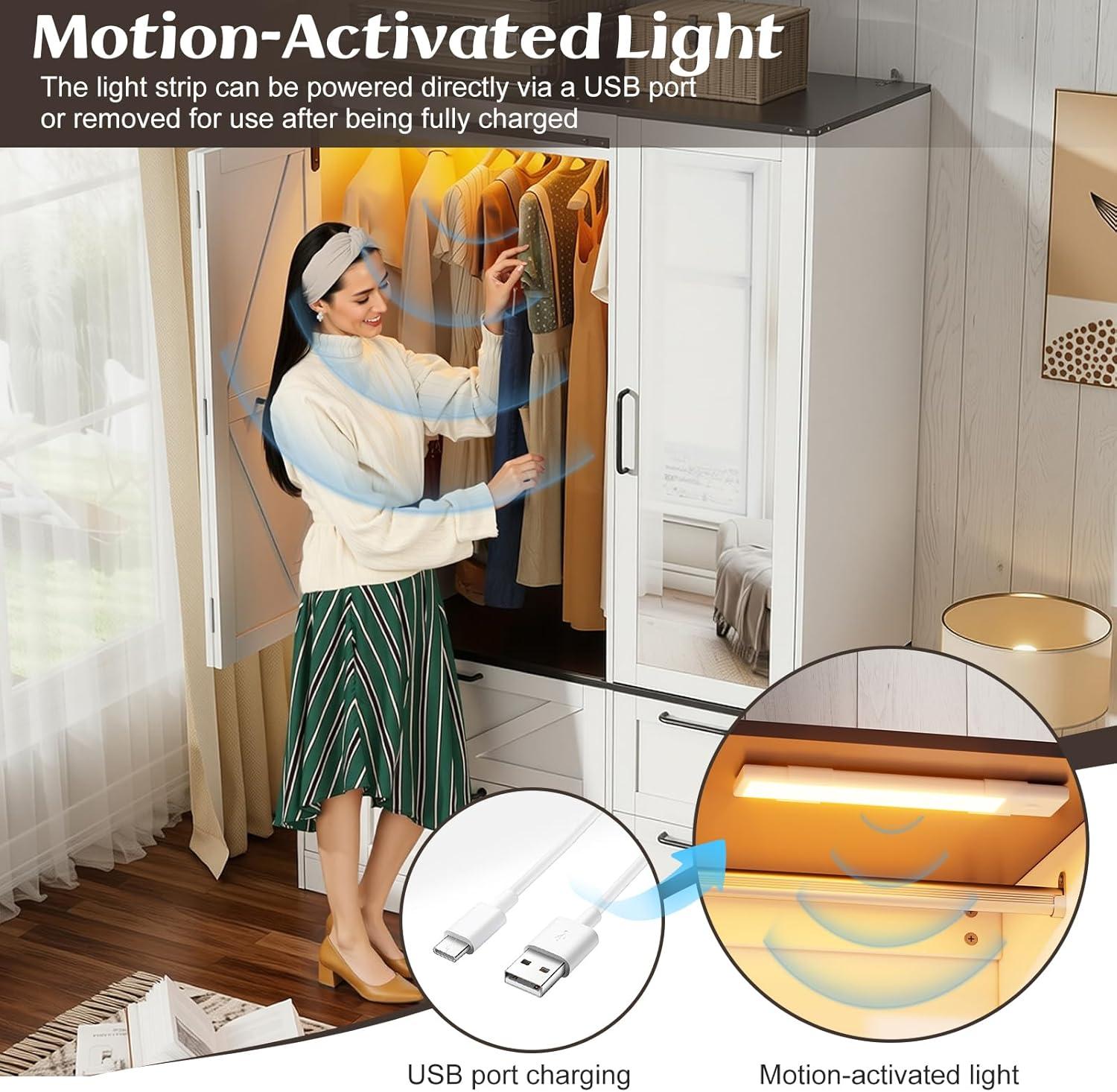 inside, the thoughtfully designed storage layout offers remarkable versatility.Four spacious drawers, dual hanging rods, and additional compartments accommodate a wide range of items, from garments to bedding. The integrated mirror and adjustable three-color motion sensor lights are game-changers, especially useful during late-night outfit selections or makeup routines. We’ve also appreciated the sturdy construction, with reinforced metal hardware and a secure anti-tip design that ensures safety and durability. This combination of aesthetics, convenience, and clever engineering truly enhances room organization while elevating the overall ambiance.