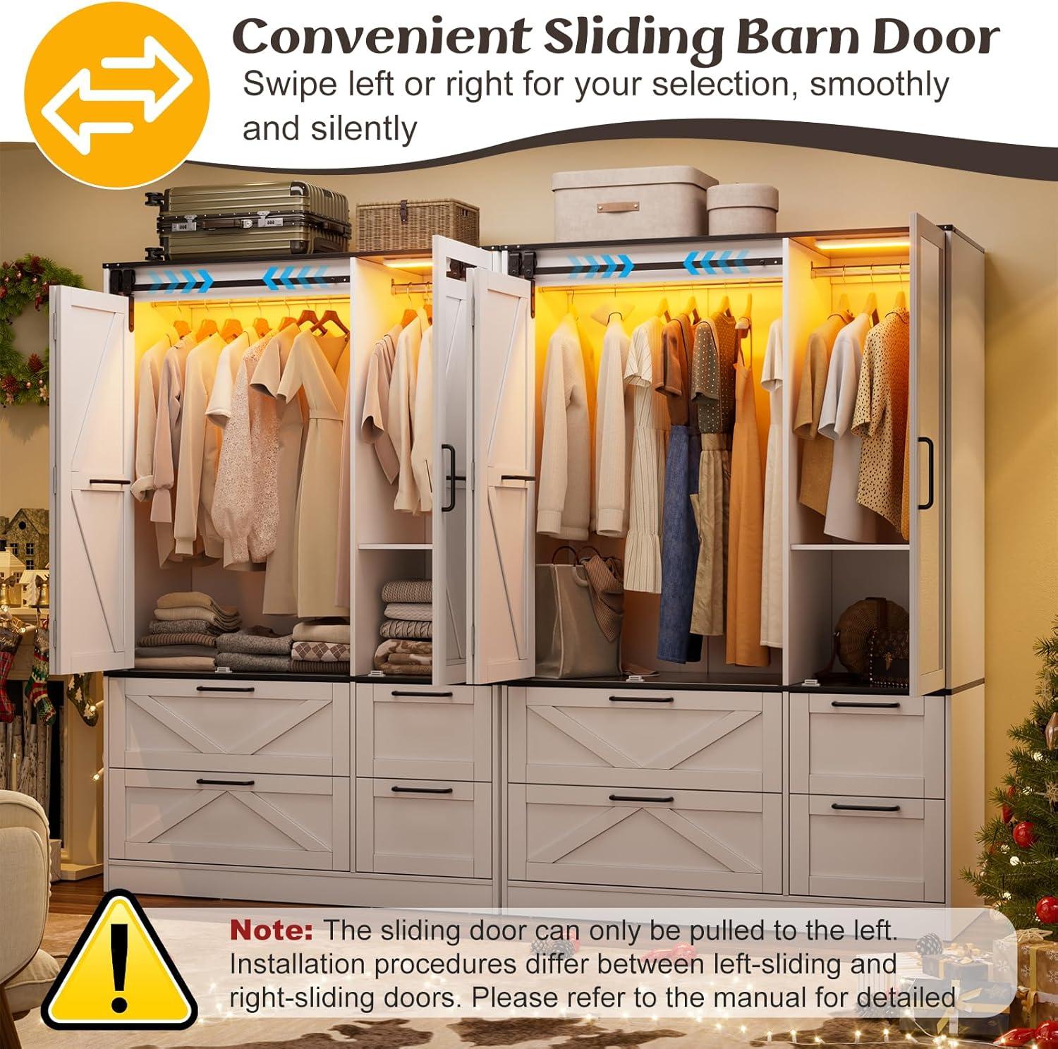 For those seeking a blend of style and practicality, this wardrobe offers a smart solution with its sliding barn doors and spacious interior. Its design is particularly well-suited for bedrooms with limited space where a traditional swinging door might be cumbersome. The sensor lighting, adjustable between cool, warm, and neutral tones, enhances usability in low-light conditions, making it ideal for night-time outfit changes or creating a cozy atmosphere. We appreciate the inclusion of a full-length mirror, which adds a convenient touch for daily routines. With four drawers, two hanging rods, and a storage compartment, it adapts effortlessly to a variety of storage needs-from clothing and accessories to bedding.