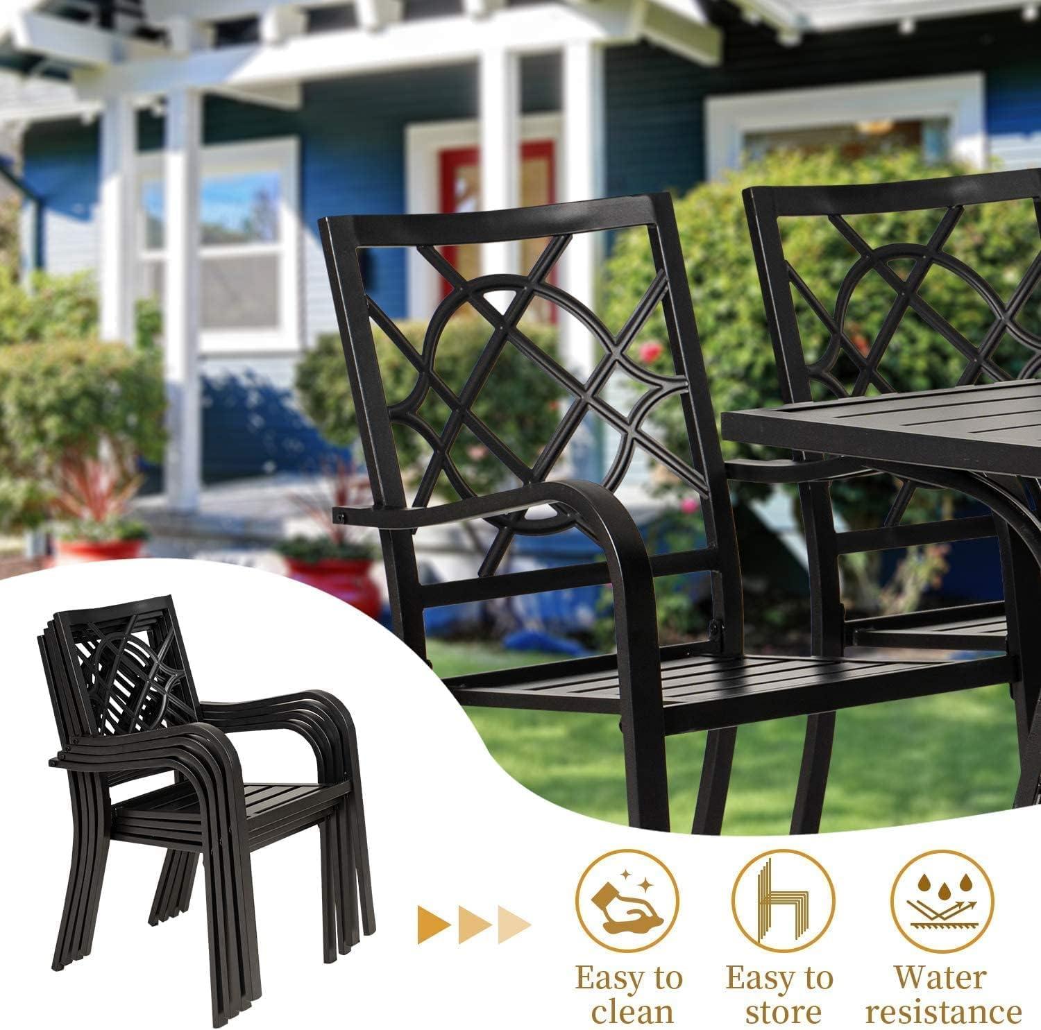 Living with the 5 Piece Outdoor Patio Dining Set, metal Furniture ​Set Square Slatted Dining Table with Umbrella Holes ‍& 4 Stackable Chairs for Backyard, Garden feels less like an ⁢arrival and more like a slow accretion of small habits as you use the patio over ​time. You ⁢notice the ‌table carving out a ⁣place for morning coffee and quick meals, the chairs shifting a little each⁤ day⁤ to where people naturally settle, and‌ the ⁢surface picking up faint marks from ​weather⁢ and hands that make it look ​lived-in. In daily routines ⁢it becomes one of ⁤the quieter backdrops, a place that holds things and supports the small rhythms ⁢of the yard. after a while it simply rests in the room ​and stays.
