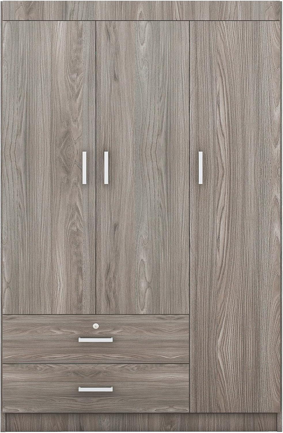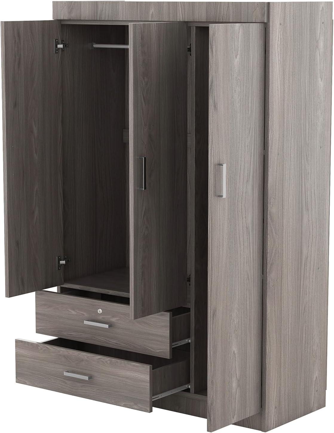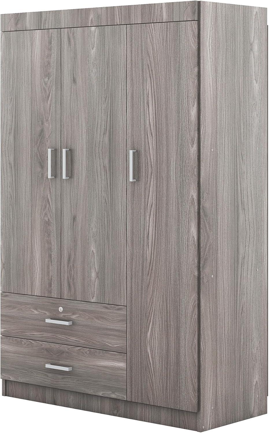 When you bring the three-door wardrobe into your room it reads first as a solid, modern presence — a clean silhouette that anchors a wall without drawing attention to itself. Up close the gray, wood-grain finish and long satin‑silver handles catch the light differently as you pass by; the doors and drawer fronts line up into a quiet, layered face that changes with the angle of the room and the time of day.