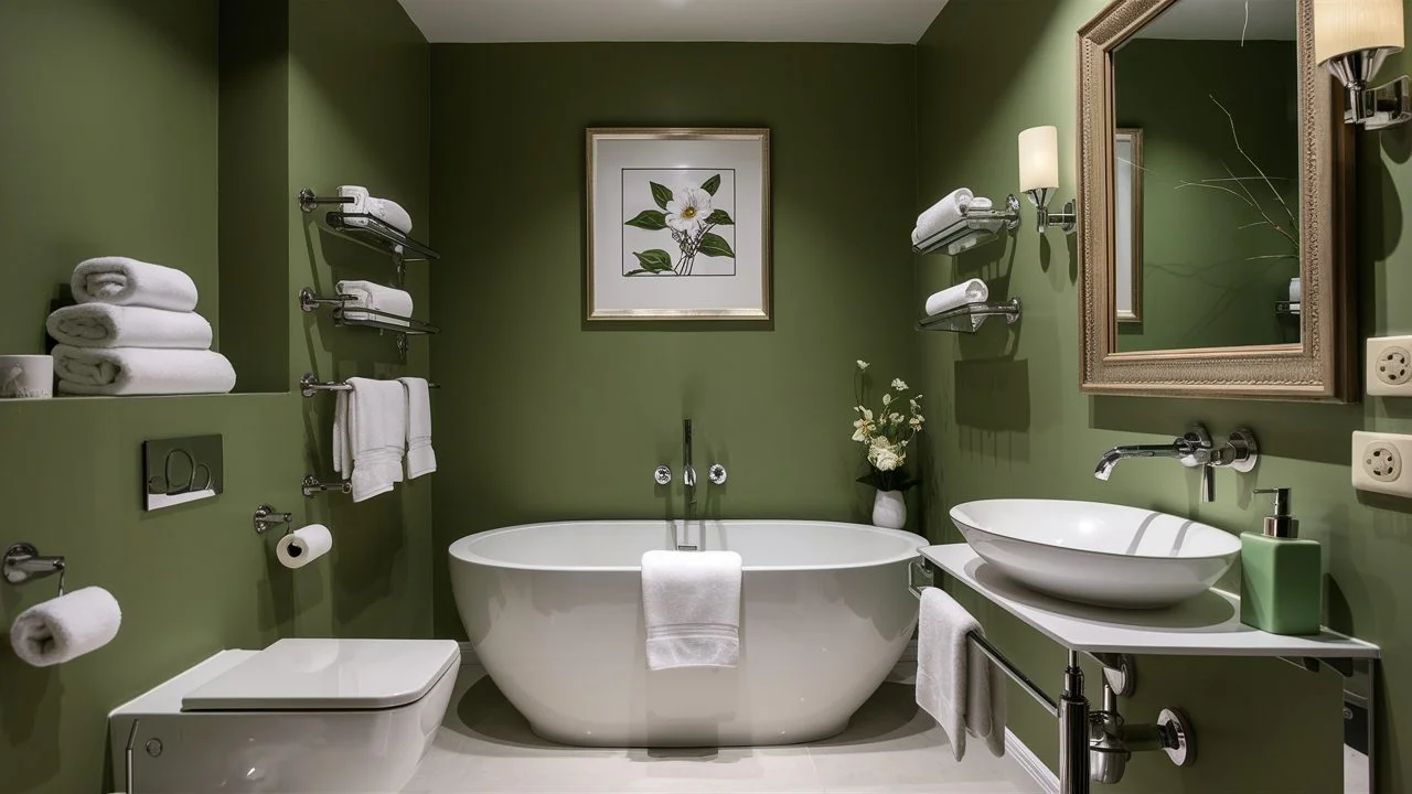 Olive green brings an earthy, refined tone to city bathrooms, blending seamlessly with industrial elements like exposed pipes and metal finishes. This combination creates a chic, modern space that balances urban edge with natural calm. Minimalist decor complements olive walls, keeping the bathroom stylish yet uncluttered.