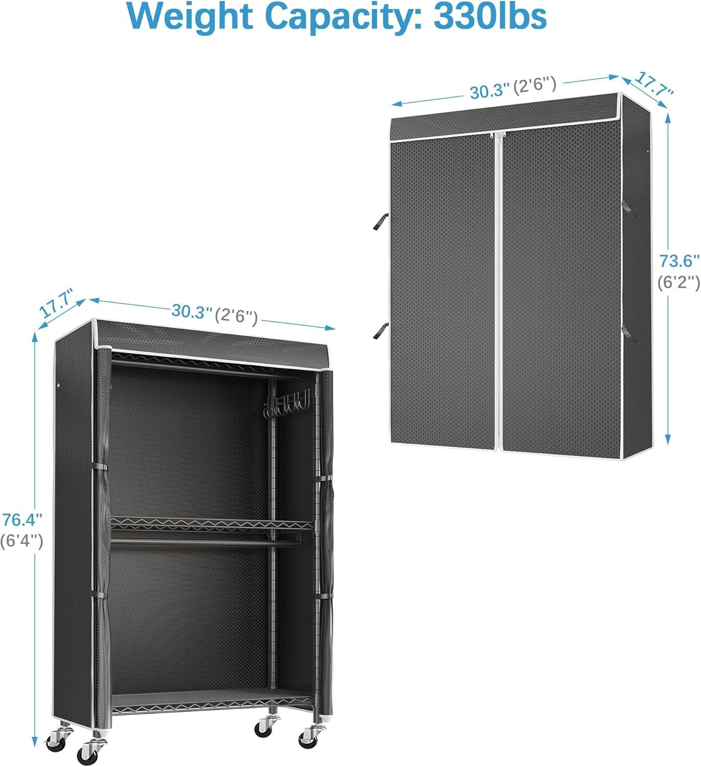 This ​garment rack​ impresses with its robust⁤ construction built from high-quality iron ‌pipes and wire, ⁤all coated with a ⁣protective powder finish to resist rust and wear.⁤ It features ⁤a versatile design with double hanging ⁢rods⁢ and three tiers, providing ample space to organize a variety of⁤ clothing items – from⁤ coats and dresses to folded⁤ sweaters ⁢and accessories. The rack ⁣supports a substantial load of up‌ to 330 lbs without deformation, making it ideal for heavy winter coats or a ⁤large seasonal wardrobe. With its smooth-rolling wheels, including two lockable ones, it offers excellent⁣ mobility ‌across ‍different rooms, combining convenience with stability effortlessly.