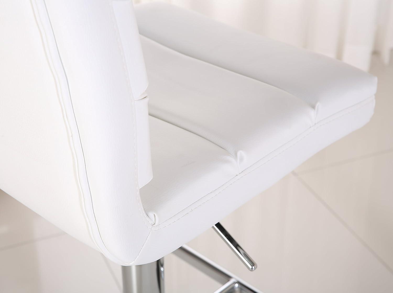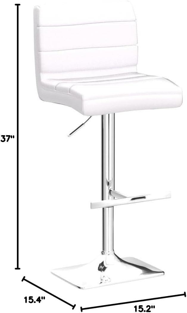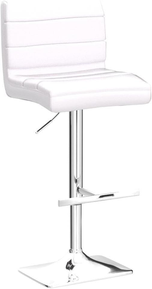 Sunlight slides across the white faux leather and brings out the faint grain and horizontal stitching; up close the upholstery feels smooth with a gentle spring when you press it. Roundhill furniture’s Bradford bar stool—thoght of here simply as the Bradford—sits at your counter with a low visual profile, its polished chrome disk catching reflections without overpowering the room. The short back reads supportive rather than decorative, and the built-in footrest is the first thing you notice when you plant your feet. A quick twist sets the seat turning smoothly; overall it looks lighter than the chrome base might imply, like an unassuming companion to everyday kitchen moments.