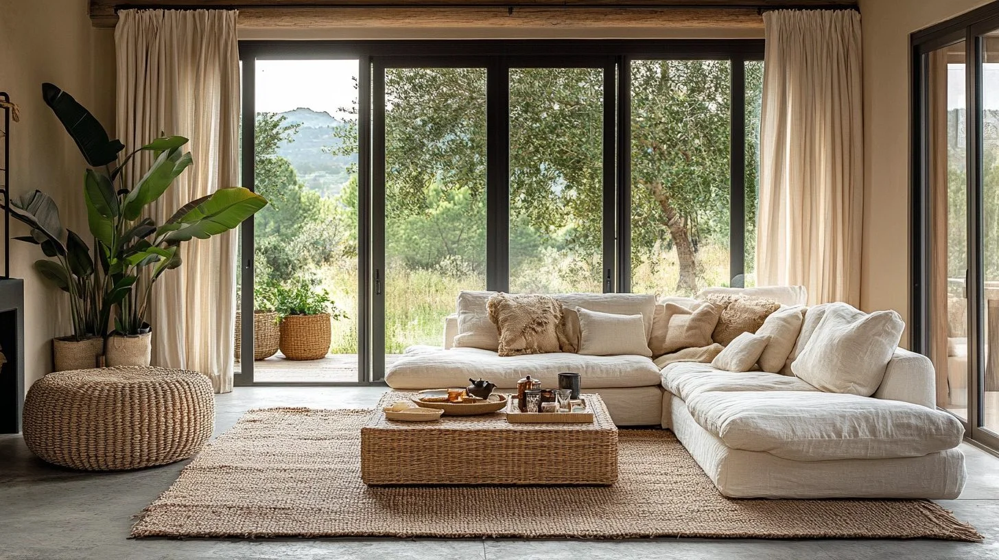 Create a warm and inviting space by layering diverse textures such as wool throws, sheepskin rugs, and heavy linen curtains. Earthy tones like beige, brown, and muted green evoke the natural world, while simple, natural-finish furniture keeps the room grounded and uncluttered.