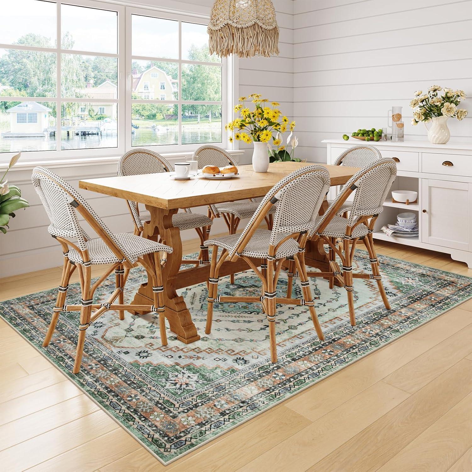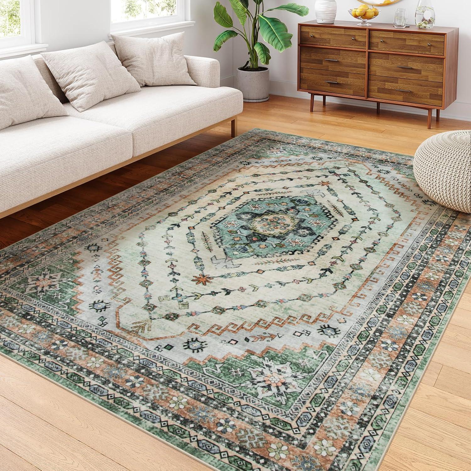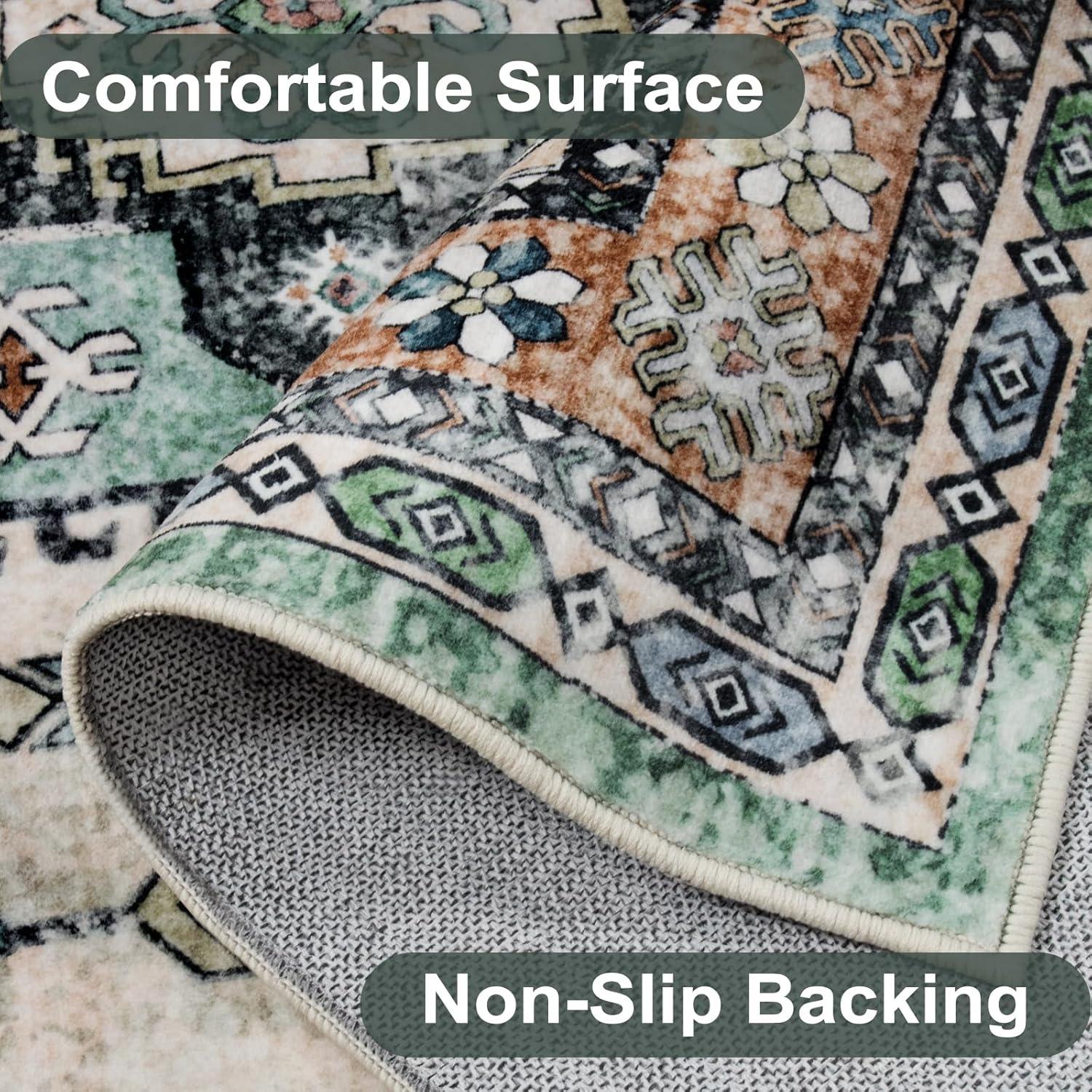 You notice, over time, how the Seavish Machine Washable area Rug 8×10, Vintage Boho Green Area Rug for Living room Non Slip, Soft Large Rugs for Bedroom No Shedding, Distressed Oriental Neutral Rug for Dining Room settles into the rhythm of the room rather than announcing itself. As the room is used—morning coffee, bare feet at night, chairs moved for meals—it yields a soft, quiet underfoot comfort and a sense of habitual presence. You see where traffic flattens the pile, where the distressed surface smooths and keeps its pattern, and how small spills and cleanings simply fold into its everyday look in daily routines. In regular household rhythms it stays.
