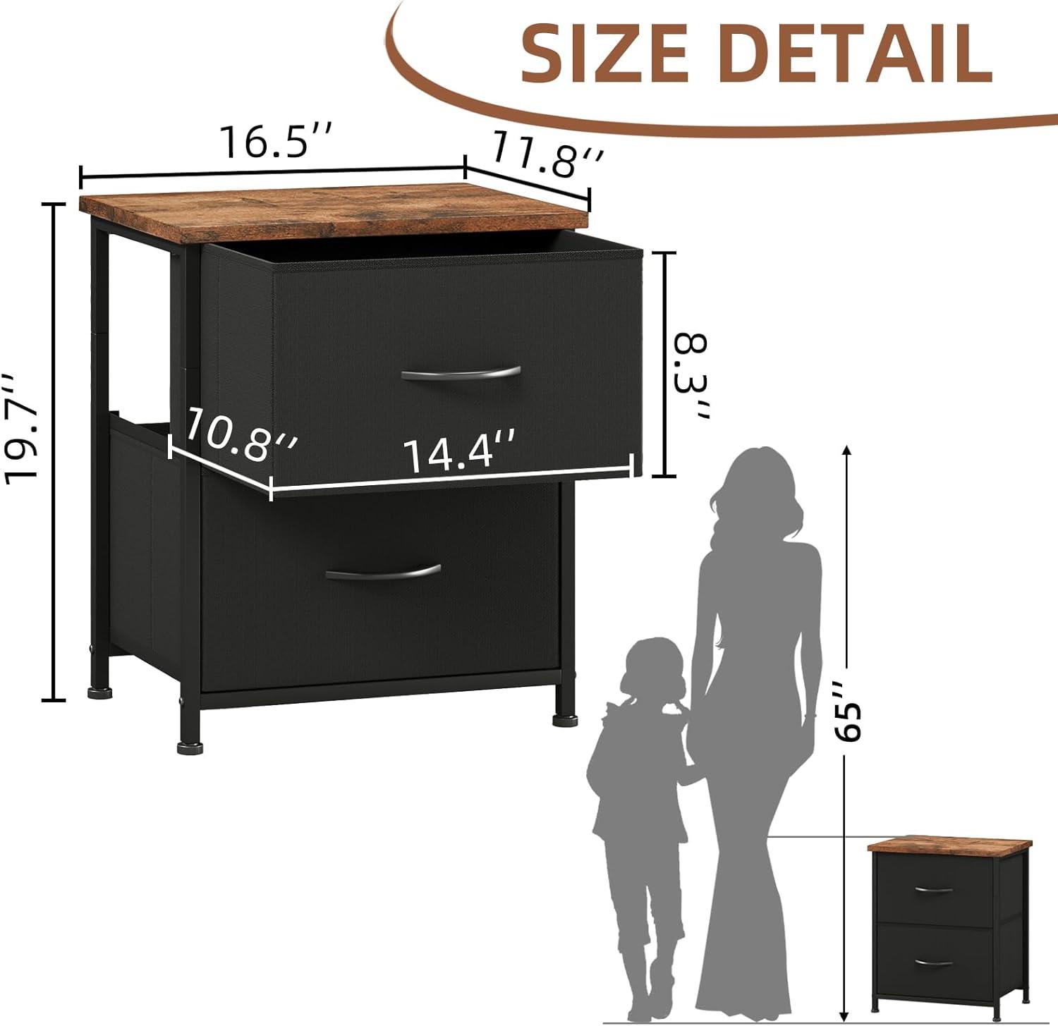 Over time you notice the Somdot nightstand, Small Dresser for Bedroom with 2 drawers, Bedside Table Night Stand End Table with Fabric Bins for Bedroom Kids Closet Dorm Guest Room, Black Rustic Brown settling into quieter usefulness, less a centerpiece and more a familiar surface where things are habitually placed. In daily routines it holds the paperback, the mug, the stray sock, and the fabric bins soften and shape to whatever you keep there as the room is used. In regular household rhythms its top gathers small scuffs and a pale ring or two, and its steady presence subtly guides moments of pause and movement. It becomes part of the room.