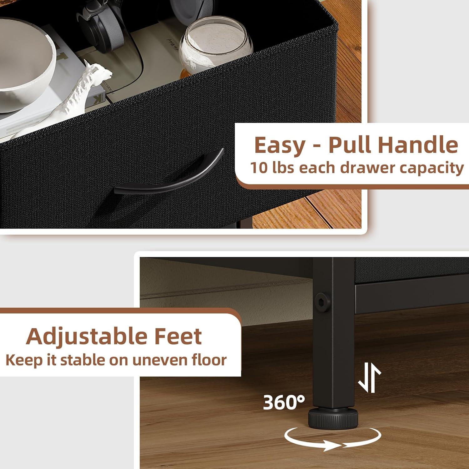Light skims across the wood‑grain top of the Somdot Nightstand, the compact two‑drawer dresser in black‑rustic brown, and the contrast between the dark frame and the warm surface is what catches your eye first. Up close the top feels smooth and slightly laminate under your palm, while the black metal frame gives the piece a lean, visual weight that keeps it from looking toy‑like. Pull a fabric drawer out and you notice how light and soft the bins are compared with the rigid frame; they slide with a muted, cloth‑on‑wood sound and collapse inward a little when empty. At eye level it sits about knee‑high beside the bed, tall enough for a lamp but narrow enough to disappear along the side; the small adjustable feet settle it level on an uneven floor, and the whole thing reads as quietly functional in a lived‑in room.