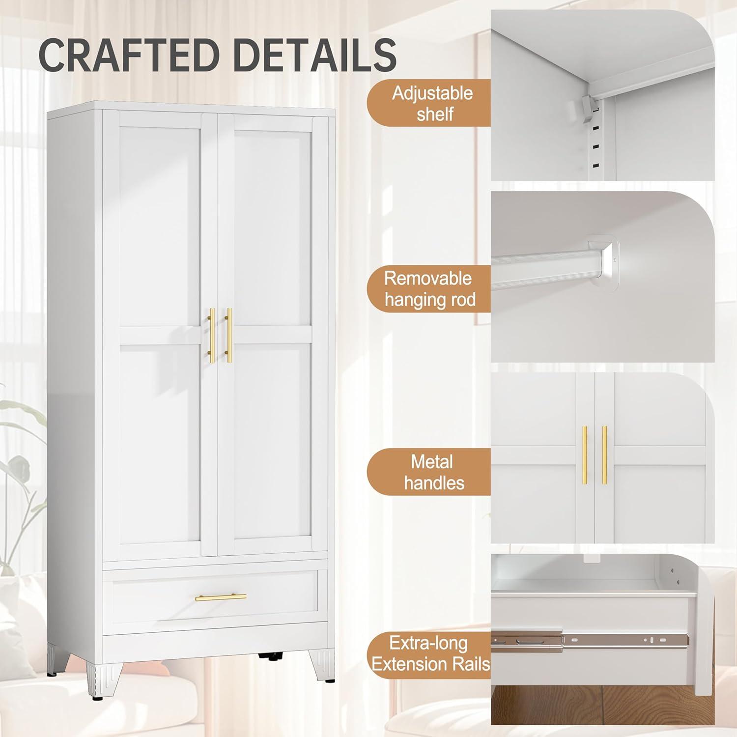 The design thoughtfully combines function with aesthetics. The white powder-coated surface is not only elegant but also simple to clean and maintain, helping us keep our space organized and clutter-free with minimal effort. The integrated drawer with its smooth glide system enhances usability, providing a neat spot for smaller essentials like socks and underwear. Below is a quick glance at key features that highlight the practical benefits of this metal armoire: