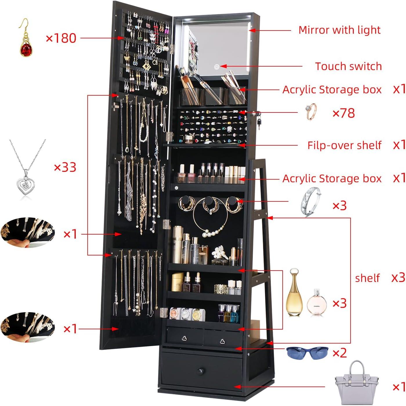 After thoroughly evaluating this jewelry cabinet with built-in mirror, we find it to be a smart investment for anyone looking to organize their accessories stylishly and efficiently. Its sturdy construction and high-quality finish give a sense of durability that will hold up well over time. The spacious interior, with multiple racks, compartments, and three drawers, accommodates a vast collection-from delicate rings and earrings to larger items and even beauty tools. The 360° rotating full-length mirror is a standout feature, offering a clear and distortion-free reflection that helps you check your outfit in its entirety. Plus, the lockable door adds a layer of security for your treasured pieces.