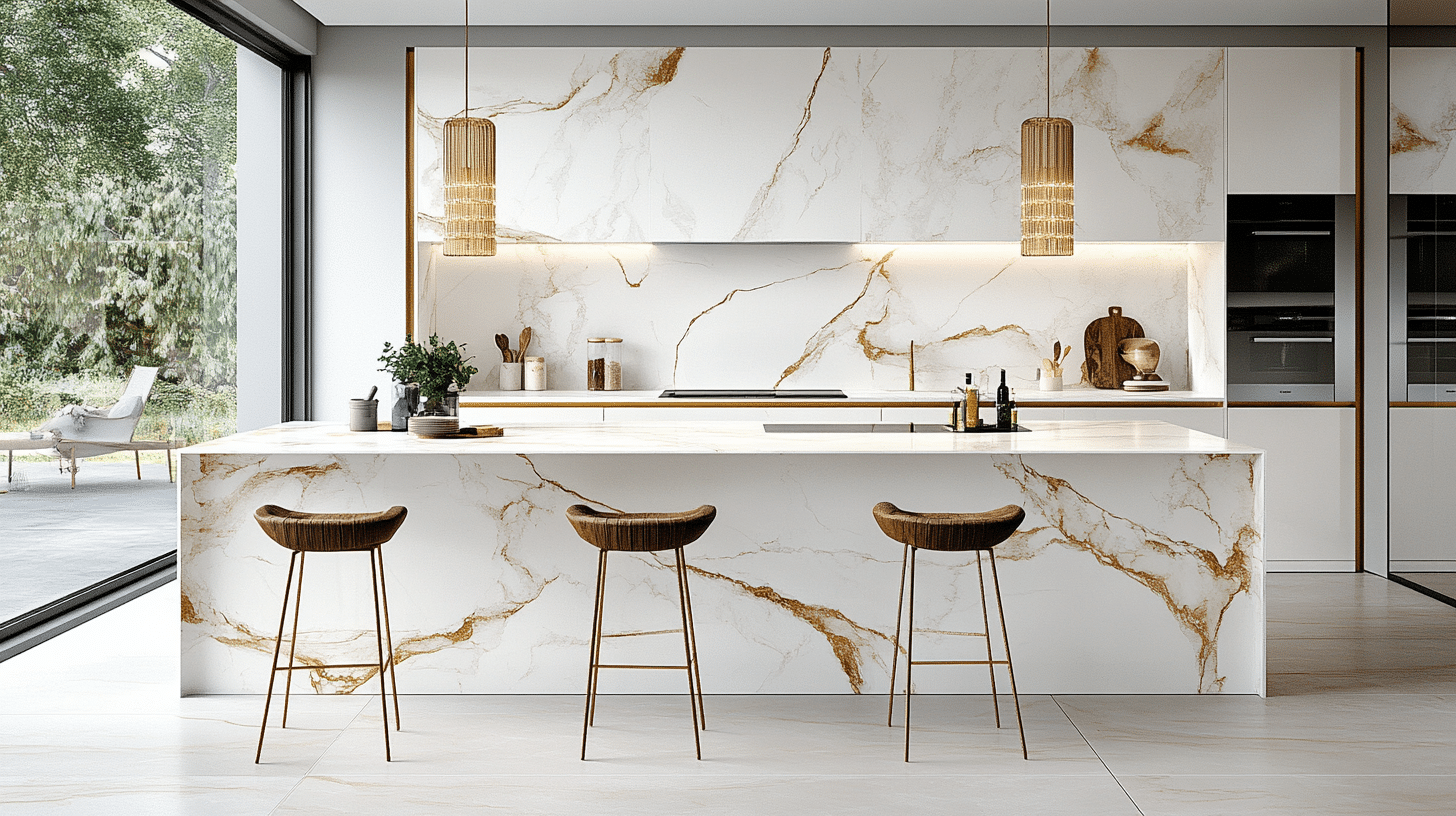 Design a breathtaking kitchen with Marble Majesty Glow, showcasing white marble countertops streaked with gold veins and complemented by gold accents. This budget-friendly approach highlights natural artistry while enhancing brightness and usability, ideal for a regal culinary space.