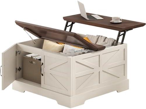 Farmhouse Lift Top Coffee Table for Living Room with 50 Gallons ⁤Storage, Square Coffee Table with Lifting Top and Barn Door for Living Room, Bedroom, Home Office (White Brown)