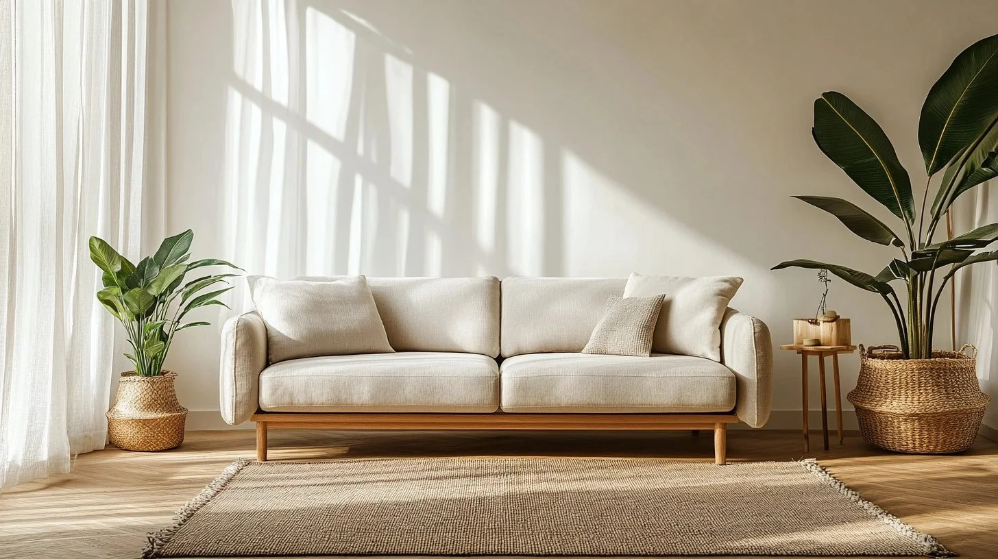 Focused on tranquility, this minimalist approach uses soft tones, sparse décor, and simple furniture to create a peaceful retreat. The grey sofa blends effortlessly with beige walls and functional pieces, fostering a calm and uncluttered living space.