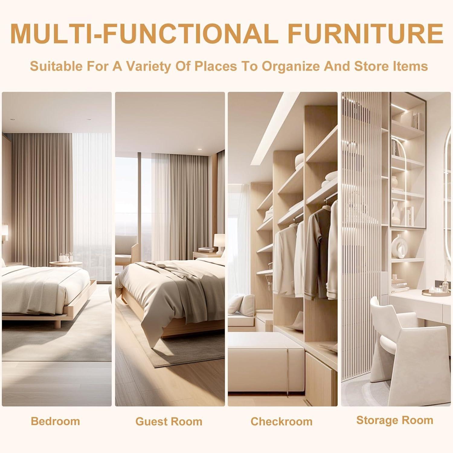 Complementing the hanging space are two spacious compartments that serve as perfect shelving for folded clothes, bedding, or less frequently used seasonal items. These compartments add a layer of versatility, allowing us to efficiently separate and categorize belongings.Below is a quick reference table summarizing the main storage features: