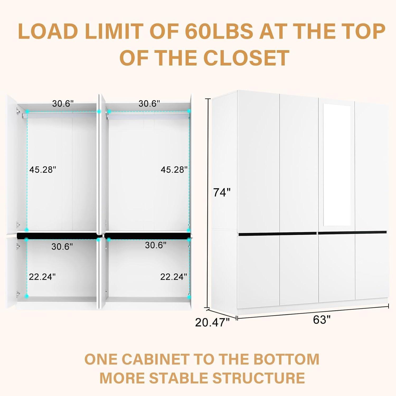 With dimensions of 74″ height, 63″ width, and 20.47″ depth, this piece demands a good amount of floor space but remains reasonably compact for its storage capacity.It fits nicely in bedrooms with moderate space and doesn’t feel overwhelming thanks to the clean, modern design. The wardrobe’s footprint allows it to house a variety of clothing without crowding your room, as summarized below: