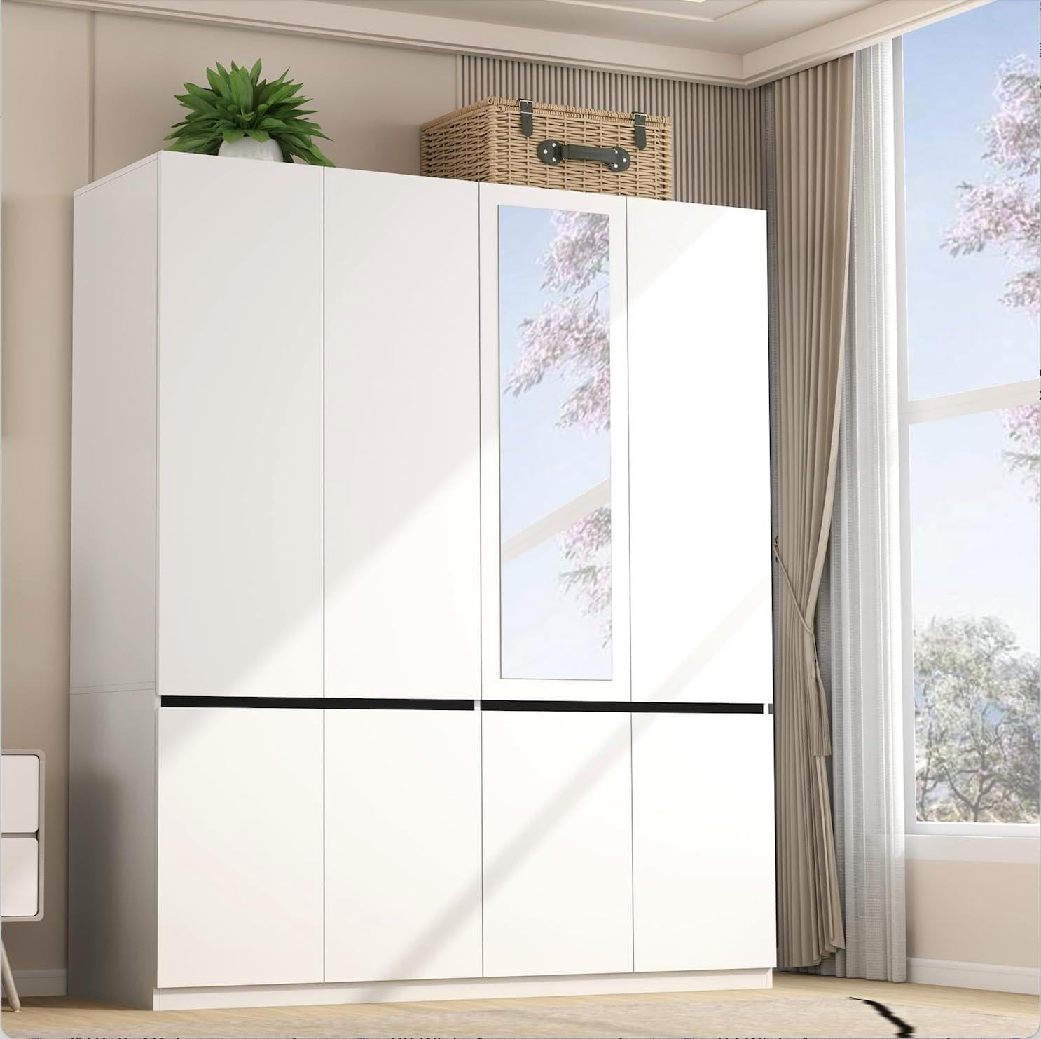 from the moment we unpacked this wardrobe, its modern, minimalist design promptly stood out. The seamless, handle-free doors paired with the pristine white finish provide an elegant, clean-lined aesthetic that effortlessly blends with a variety of bedroom décors. One of the most practical features is the full-length mirror integrated into the door-a thoughtful addition that allows us to check our outfits conveniently, adding both style and functionality to the piece. The elevated base and smooth surface not only lend a refined touch but also make cleaning and maintenance surprisingly simple.