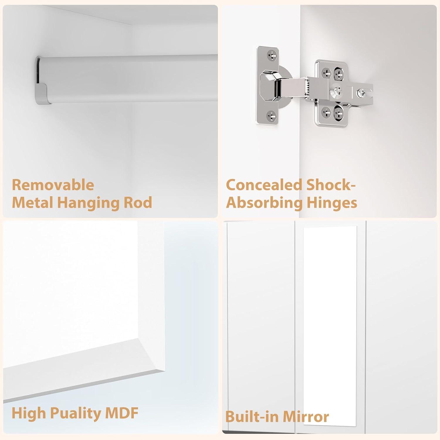 When it comes to durability, this piece truly stands out. The robust metal hanging rods are specifically designed to bear the weight of longer garments like coats and dresses without bending or warping, which preserves the shape and integrity of stored items. Additionally, the full-size doors close securely and align well, thanks to carefully engineered hinges and hardware. However, we recommend taking care during assembly and relocation due to its considerable weight and the delicate nature of the full-length mirror. Below is a quick overview of key material features and durability factors: