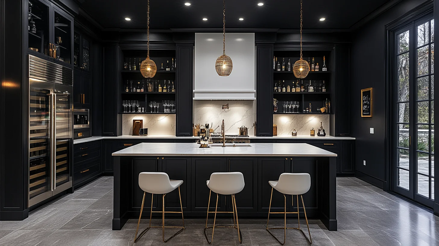 Create a dramatic kitchen space with deep black walls and pristine white furnishings, evoking a gallery-like ambiance. Soft lighting ensures the room remains warm and inviting despite the stark contrast, perfect for those who enjoy bold, statement interiors.