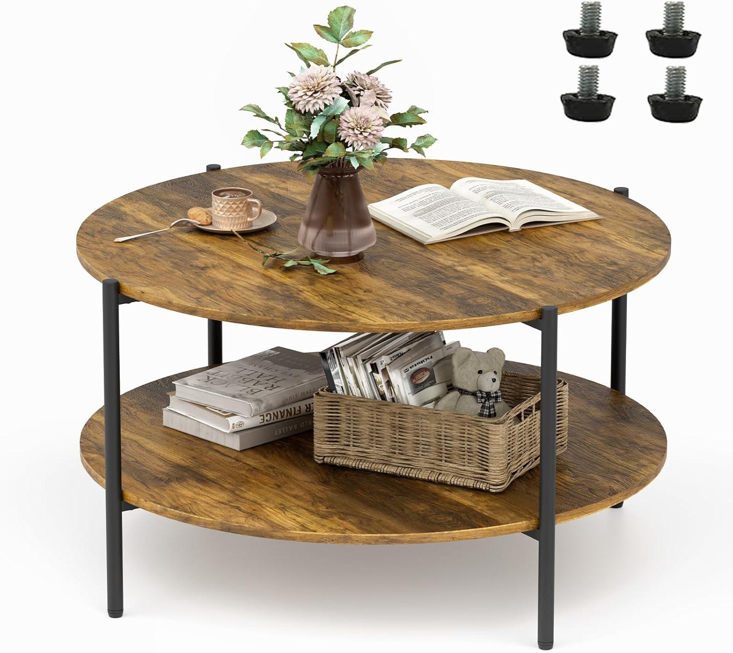 Round Coffee Table with‌ Retro Double-Layer Design and Vintage ⁤Wood Finish