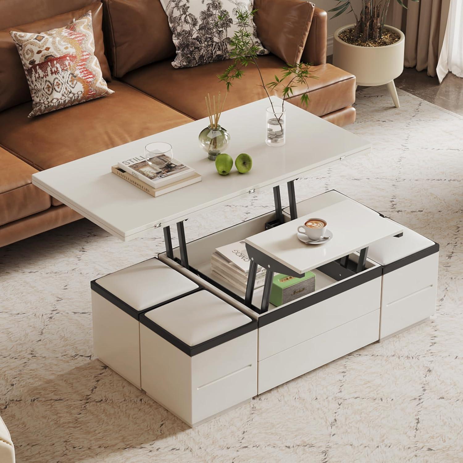 Lifting Coffee Table with Four Stools,Modern Multifunction Coffee Table with Wheels ‍and ‌Storage,Space ⁣Saving for Living Room and Office (47.24 inch)