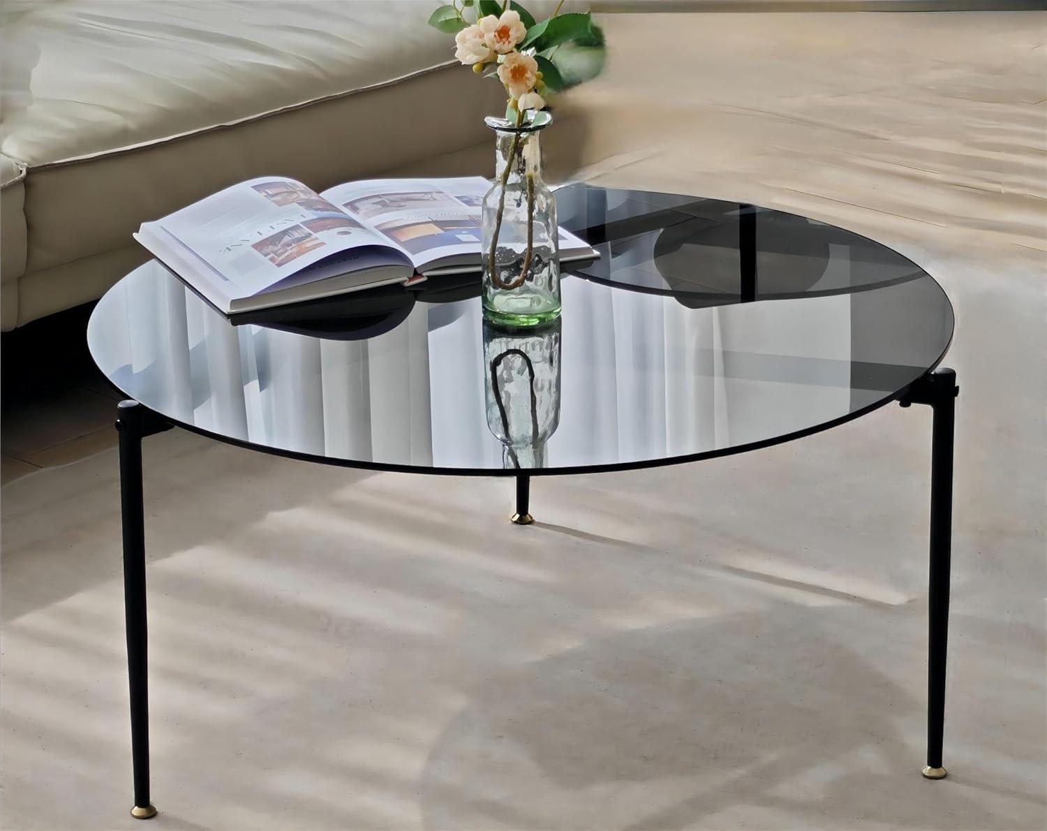 This elegant piece boasts a 31.5-inch diameter tempered glass top, designed to bring a sleek and sophisticated vibe to any living area. The grey glass surface showcases a stunning transparent and glossy finish, enhanced by a strong black metal frame accented with glittering golden feet. Perfectly sized at 15.8 inches tall, it provides ample space to display decorative items, store books, or serve refreshments. Beneath the tabletop, a convenient storage shelf offers added practicality without detracting from its luxurious appearance. The robust tempered glass can withstand up to 40lbs and withstands temperatures up to 300°C, ensuring durability and safety for everyday use.