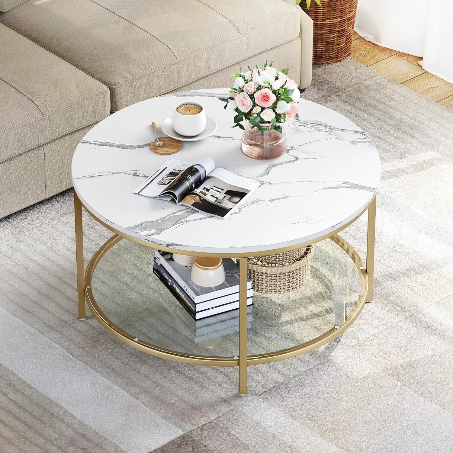 This stylish coffee table features a sleek round design with a white marble pattern top, paired with a durable glass lower tier, supported by a striking goldtone metal frame.Its modern silhouette adds a touch of sophistication to any living space, while the combination of wood and metal materials ensures both style and sturdiness. With dimensions of 22.4 inches in length and width, and 18.1 inches in height, it fits perfectly in compact areas without sacrificing surface area. The gold finish on the frame enhances the contemporary vibe, making this piece a focal point in a modern home.