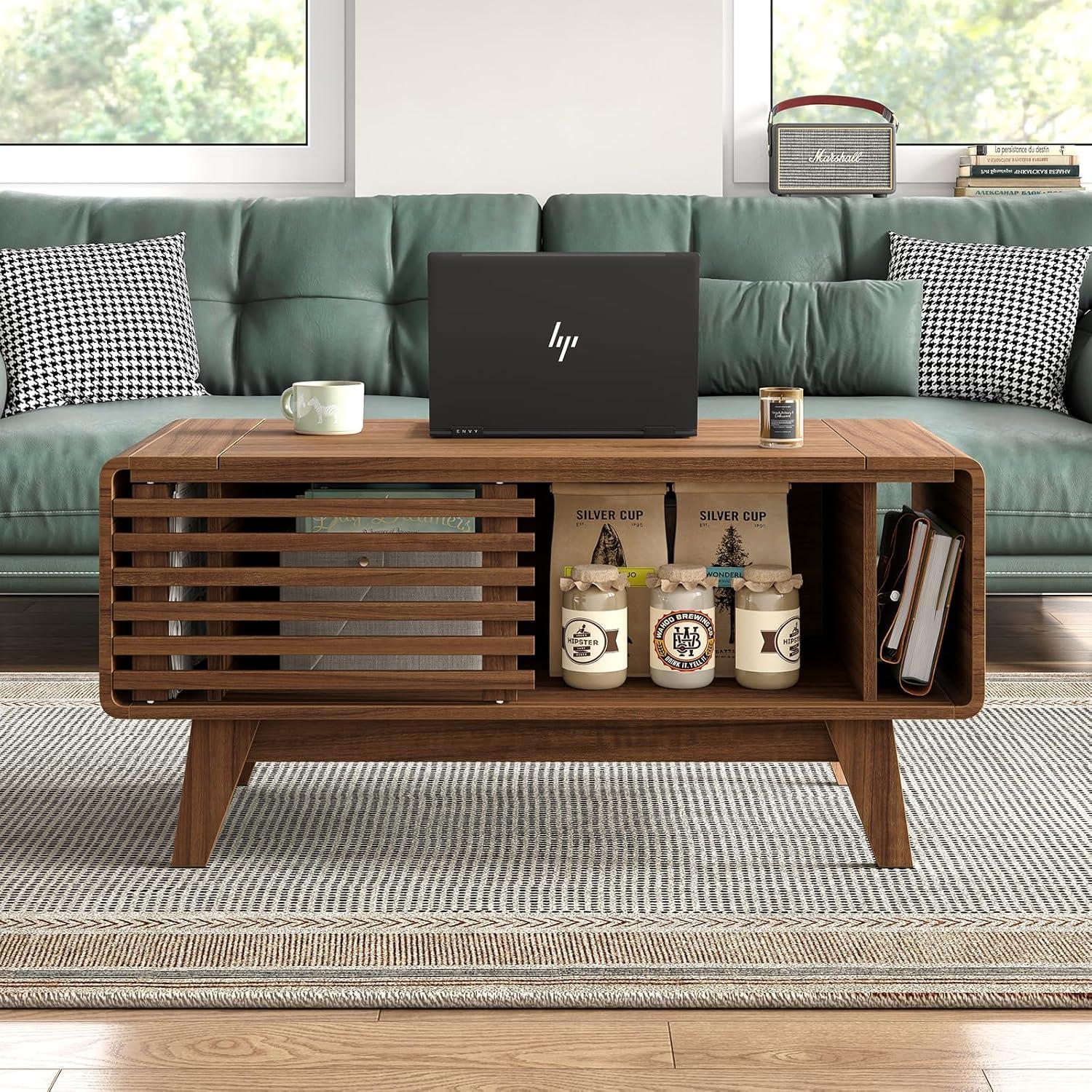 This elegant coffee table boasts a beatiful walnut wood grain finish that merges rustic charm with contemporary design. Its slatted sliding door design adds a modern touch while maintaining a farmhouse aesthetic. The lift-top mechanism with a smooth spring action allows the tabletop to be raised or lowered quietly, transforming it into a versatile workbench or casual dining surface. Rounded corners enhance safety, especially for homes with children, softening the overall streamlined look. The heavy-duty construction distributes weight evenly across all four legs, ensuring lasting stability and strength.