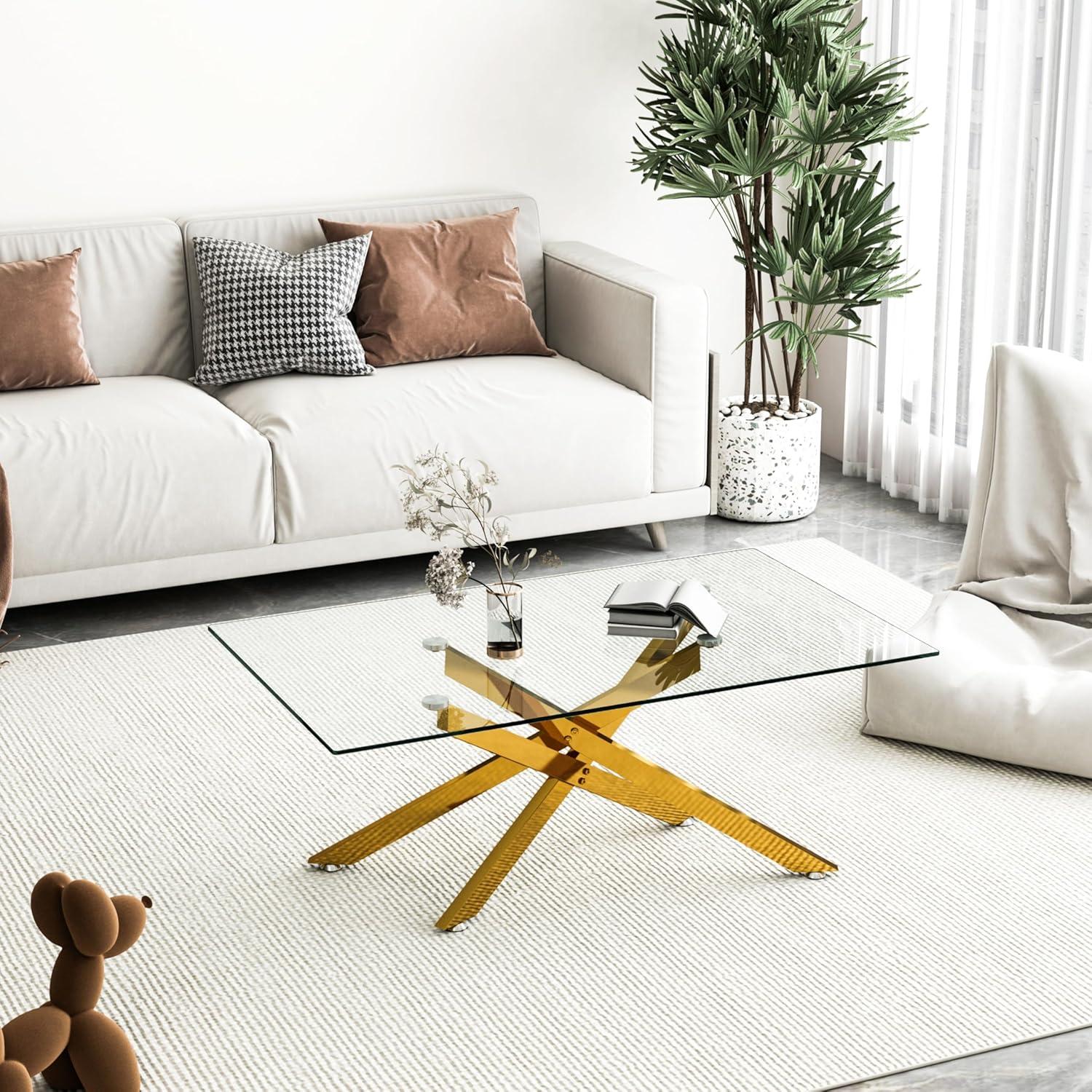 modern Glass Coffee table with Tempered Top and Sleek Metal Legs, 39.37×23.62×18.11 inches, Gold Finish