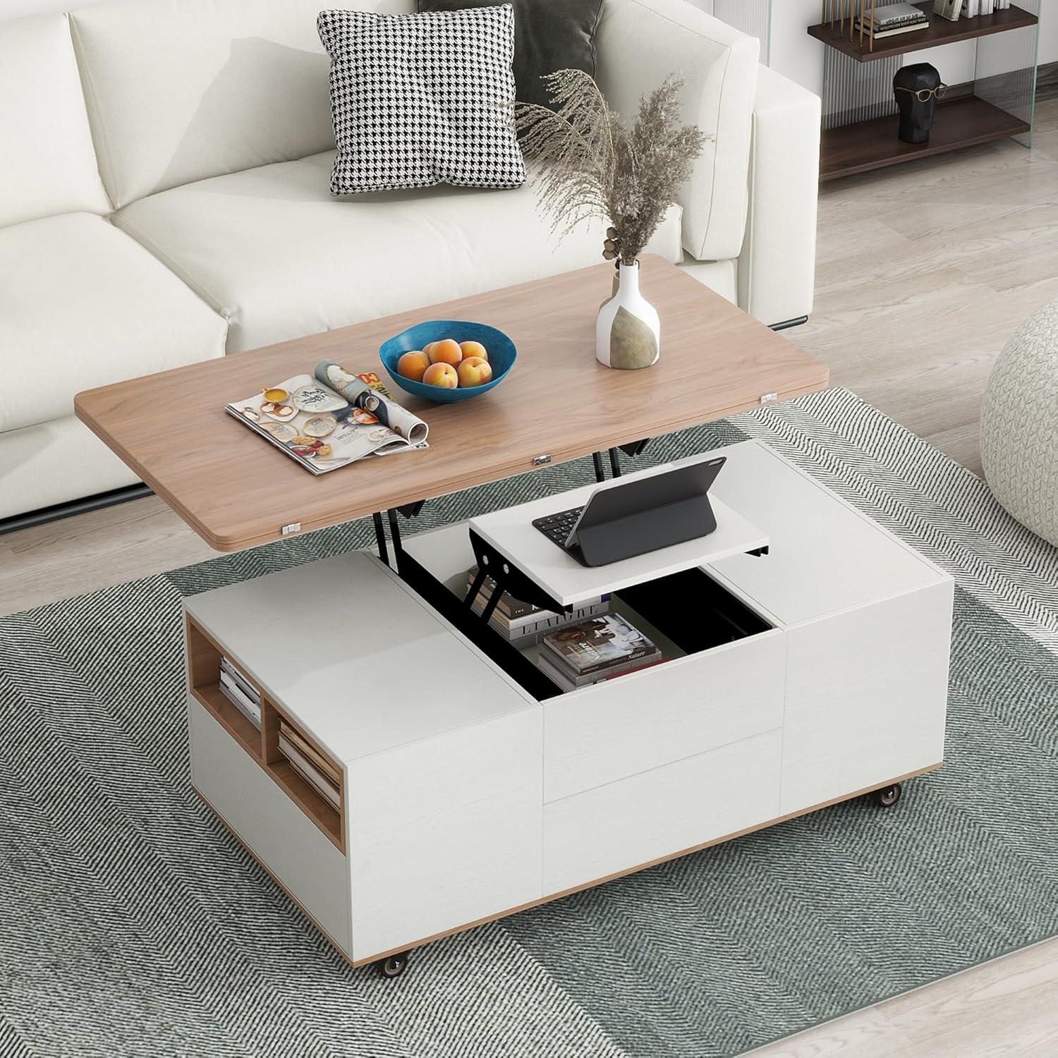 This versatile piece features a hydraulic lift-top mechanism that smoothly elevates the tabletop to a comfortable height, transforming it effortlessly from a stylish coffee table into a functional dining or workspace. Crafted from high-quality MDF with a sleek walnut and white finish, it offers durability and elegance in one compact design.Ample storage is provided through three spacious drawers, accompanying shelves, and a hidden compartment beneath the lift-top, making association easy and helping keep your living area clutter-free. Lockable universal wheels add mobility, allowing for easy repositioning without compromising stability.