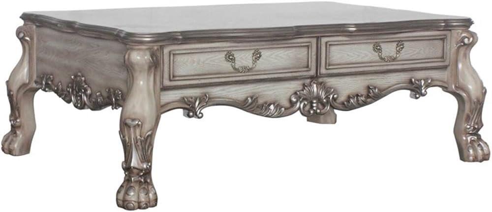 This exquisite piece brings a fresh twist to traditional design, boasting a scalloped wooden top that adds elegance and charm to any living space. its oversized claw legs lend a bold, sturdy presence while the raised floral motifs enrich the table’s vintage appeal, making it a true statement piece. Beyond its eye-catching details, it offers practical storage with two spacious drawers, perfect for keeping your living room essentials neatly tucked away.