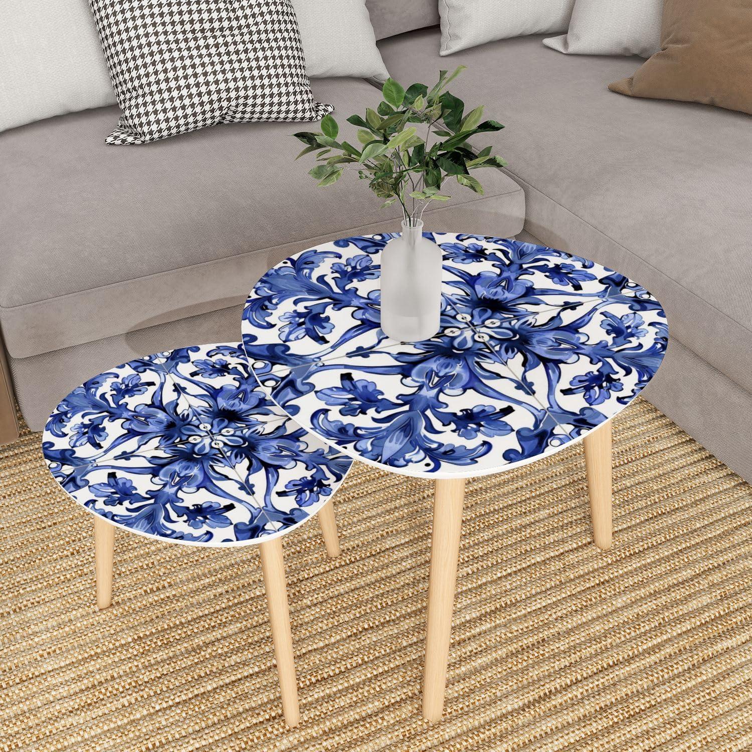 Elegant Ceramic Style Nesting Tables with Blue Decorative Flourishes for Versatile Living Spaces