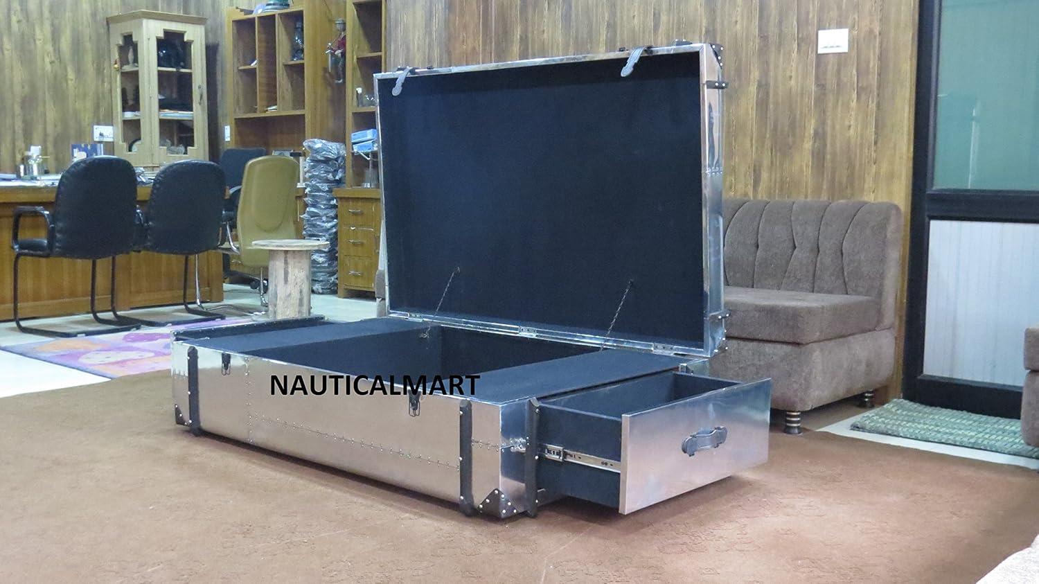 Crafted to evoke the spirit of grand voyages,this table features a polished aluminum exterior wrapped around robust hardwood frames,accented with exposed steel screws for a vintage industrial vibe. The matte finish is deliberately distressed with small scratches and dents,adding unique character to each piece. Antique brass trims and leather handles complement the aged wood strips bracing the body, while rounded corners and inset drawer pulls give it sleek, aerodynamic appeal. Inside, a black cotton canvas lining with two hidden drawers enhances functionality without compromising style.