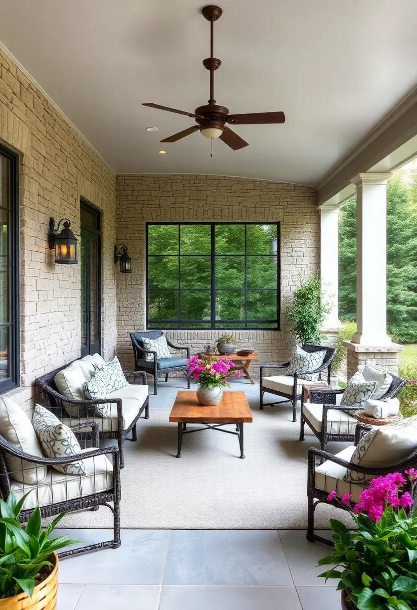 The interplay of textures is essential to achieving this serene retreat. Consider mixing natural fibers like wool and linen with the rough-hewn stone surfaces to balance elegance with rustic charm. Here are some ideas to enhance your porch ambiance: