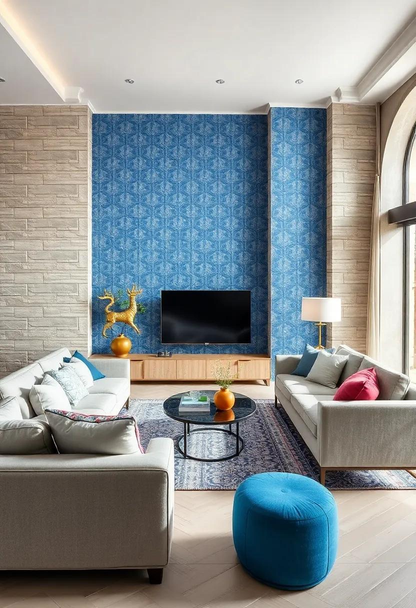 Transform Your Space: Stylish Living Rooms Featuring Blue Patterned Wallpaper