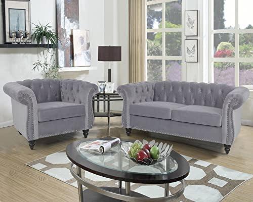 Stylish Grey Chesterfield Sofa Set with Accent Chair