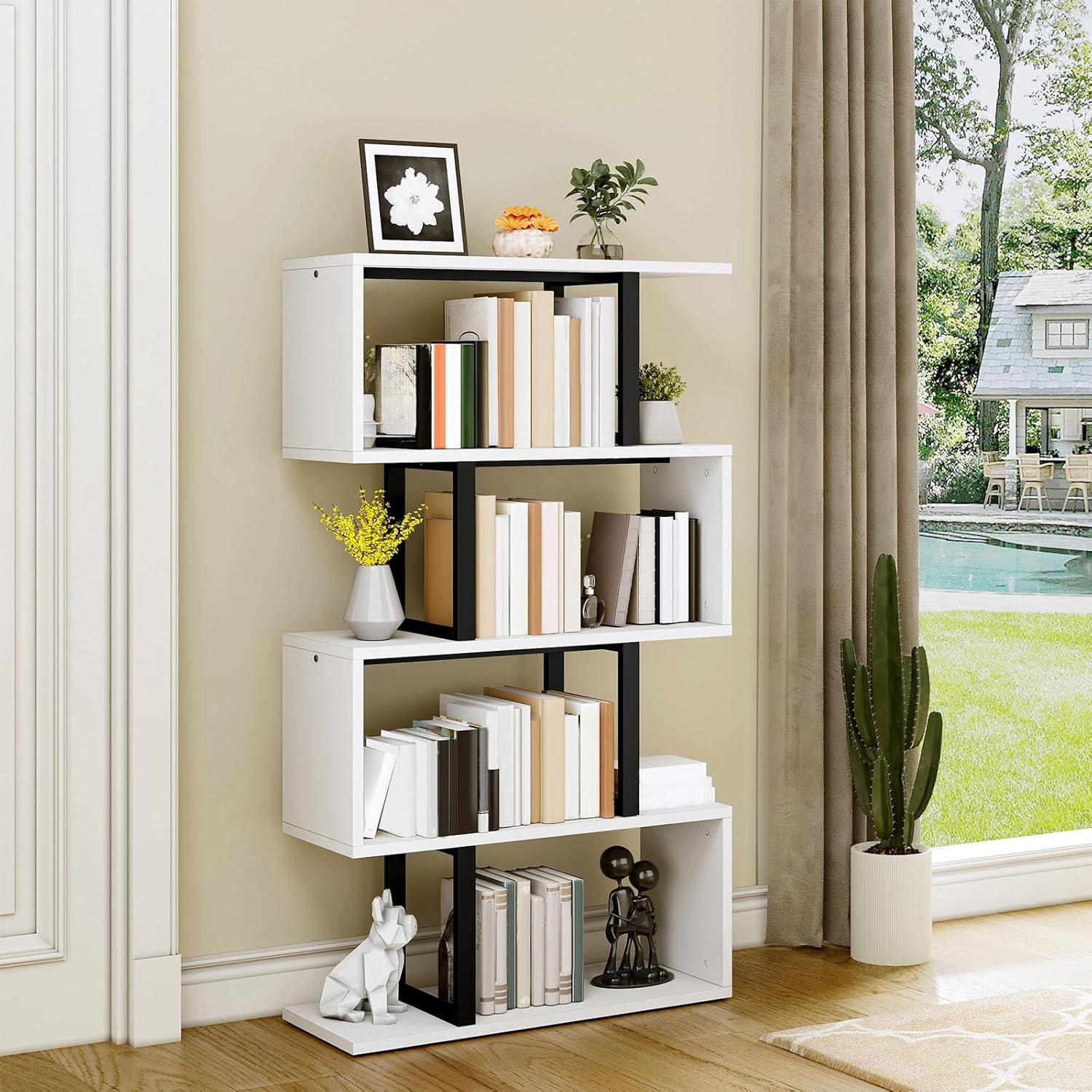 We appreciate how this unique S-shaped bookshelf blends functionality with modern design, turning a simple storage solution into a piece of art. Its 5-tier layout offers ample space not only for books but also for a variety of items like plants, collectibles, and office files. Built with sturdy waterproof particle board and a powder-coated metal frame, it promises long-lasting durability and solid support for heavier items, thanks to the added cross bars. Plus, the thoughtful inclusion of anti-tipping devices and non-slip feet ensures safety and stability, making it a reliable choice for busy households or professional environments alike.