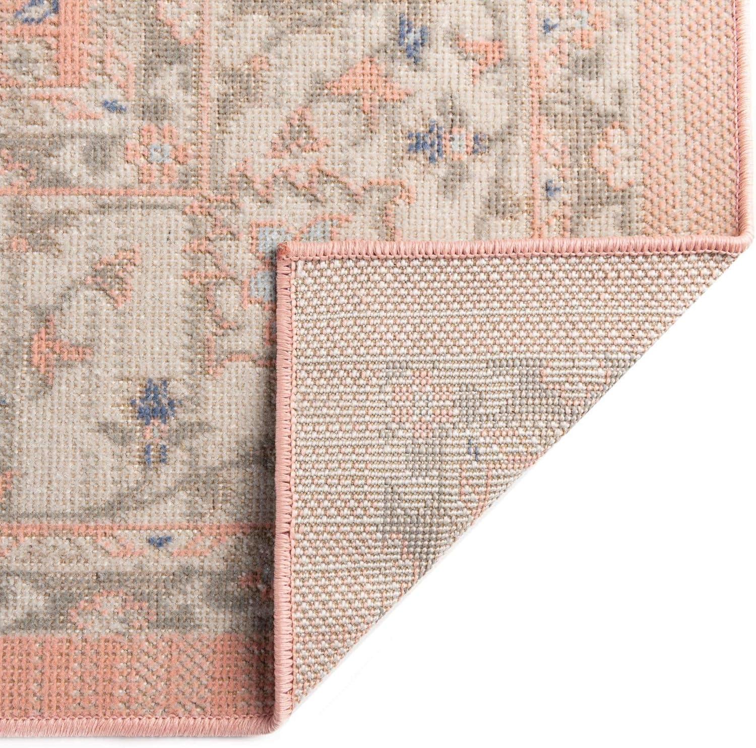 In everyday use the rug largely aligns with expectations for a low-profile, patterned floor covering: the floral and medallion motifs remain readable but tend to soften as foot traffic follows the same paths. In natural and artificial light the powder-pink tones shift slightly, appearing paler in dimmer rooms and brighter near windows; the subtle abrash that gives the design a “vintage” look also helps disguise light soiling and traffic lanes as those areas settle. After furniture is placed and cushions are adjusted during normal living, the pile flattens where weight concentrates while surrounding areas keep more texture, so the pattern reads unevenly at close range though from across the room it still reads as a coherent field.