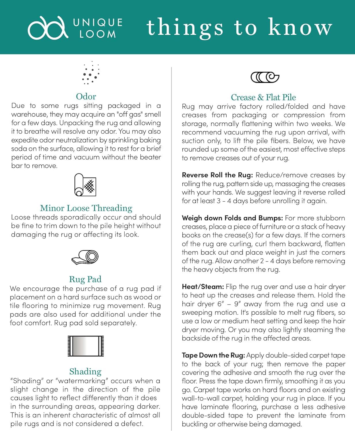 Care details, placement notes, and common changes observed as the rug settles into your home