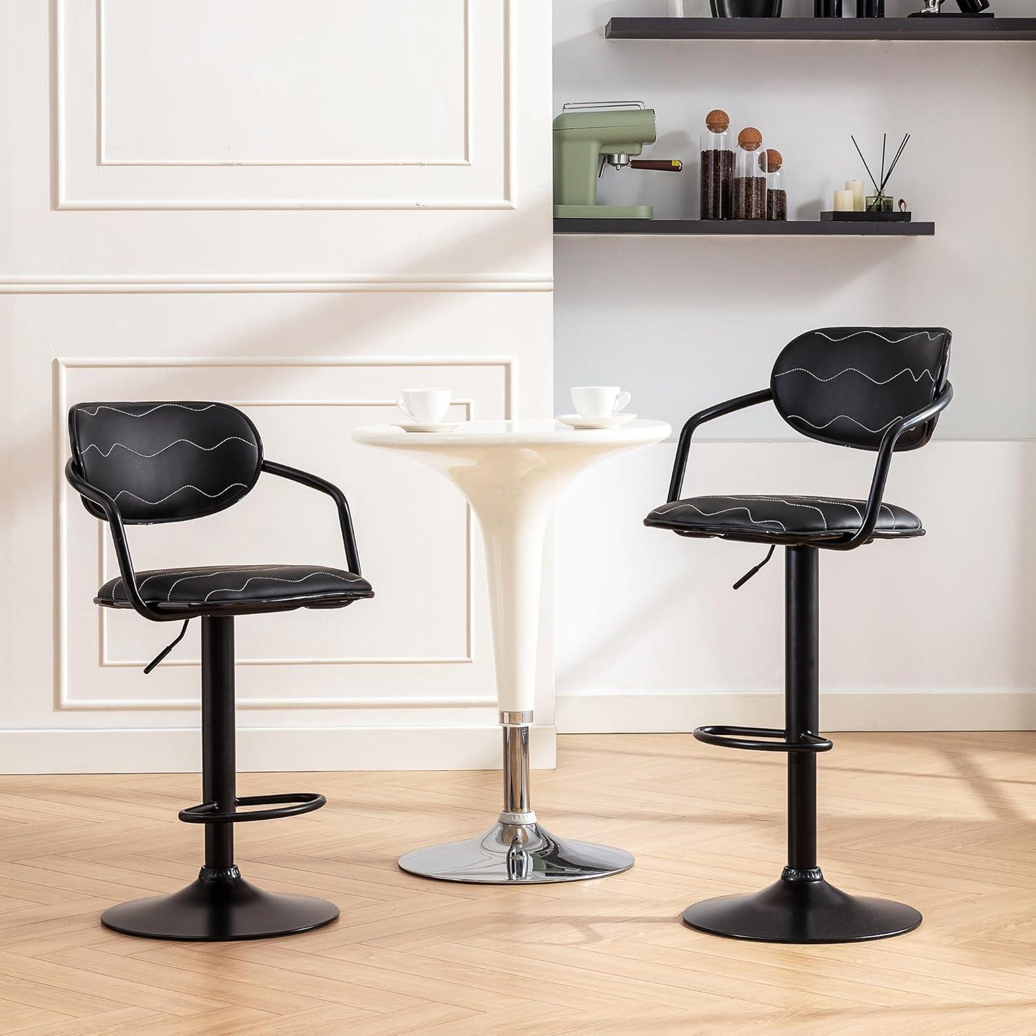 Sunlight slanting across the island picks out a soft sheen on the black PU, so you notice the seat’s smoothness before the metal base settles the view. They’re the VECELO Bar Stools Set of 2, a compact pair whose low-profile backs and arm cradles feel more everyday then showy. Pull one closer and the footrest is steady, the cushion gives a quiet, even sink, and the swivel turns without drama—small motions that make them feel lived-in. Up close the PU is cool under your hand and the matte base reads visually light, the sort of presence that quietly organizes the corner of a room.