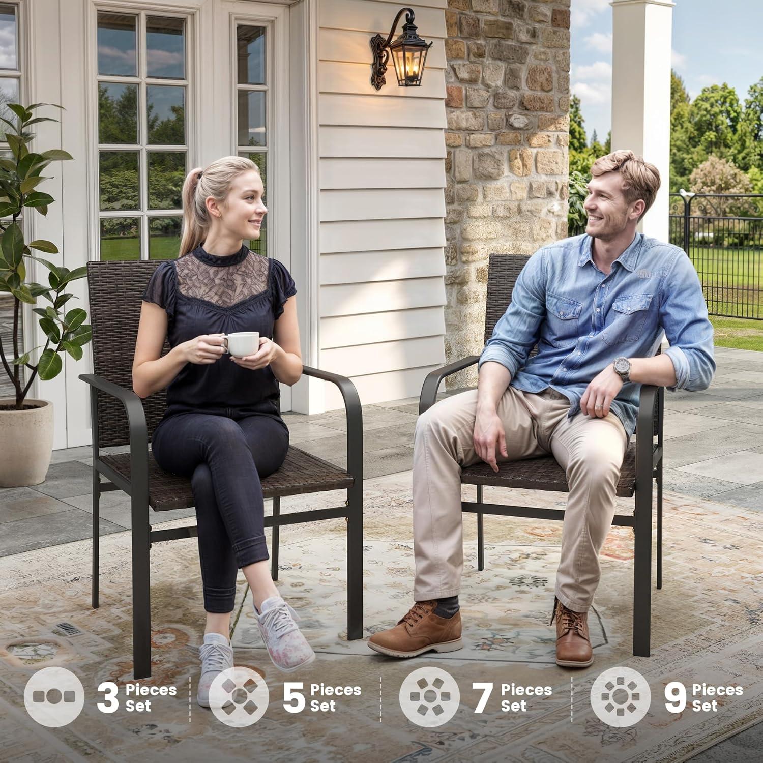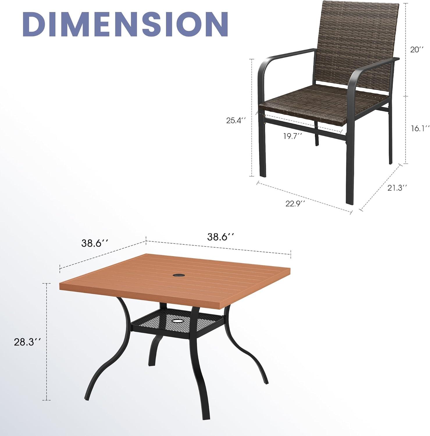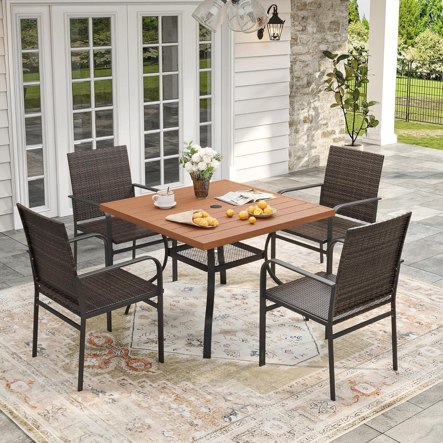 when you live with the VICLLAX 5 Pieces Outdoor Dining Set with Rattan Patio Chairs,38.6 Inch Plastic patio Table, Adjustable Umbrella Hole & Storage Shelf – Patio Furniture for Lawn, Brown Wicker and Walnut tabletop, it slowly stops announcing itself and starts keeping time with the household. Over time you notice the chairs take on habitual spots and the cushions ease into the shape of familiar evenings,while the table top shows small scuffs and pale rings that simply record ordinary use. In daily routines the set occupies space in predictable ways — places to lean, to set down a mug, to gather briefly — and becomes part of how the room is used. In regular household rhythms it stays.