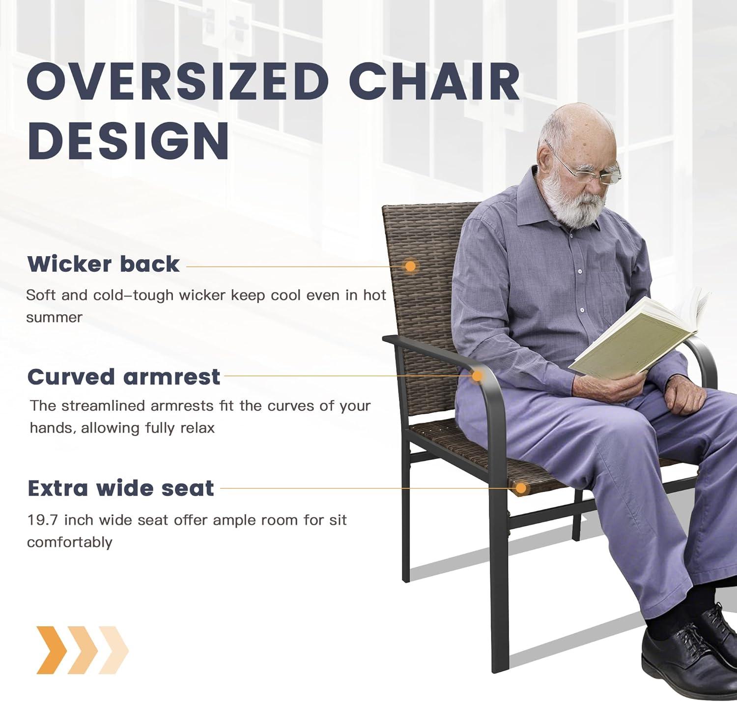 when you use the set, small habits quickly develop: you tend to drag a chair back, smooth the seat cushion with the heel of your hand, and flick crumbs from between the rattan rows. After a shower the woven seats hold beads of water for a few minutes before the sun helps them evaporate, and the tabletop can look spotted until it’s wiped down. Running a damp cloth along the metal frame frequently enough reveals tiny streaks where rain pooled,and zipper pulls or seams on the cushions can feel slightly stiff when damp and then relax as they dry. Over the course of a few weekends you’ll notice the wicker’s surface losing some of its initial sheen in direct sun,while occasional shifting of cushions and straightening of the chair backs becomes part of routine use.