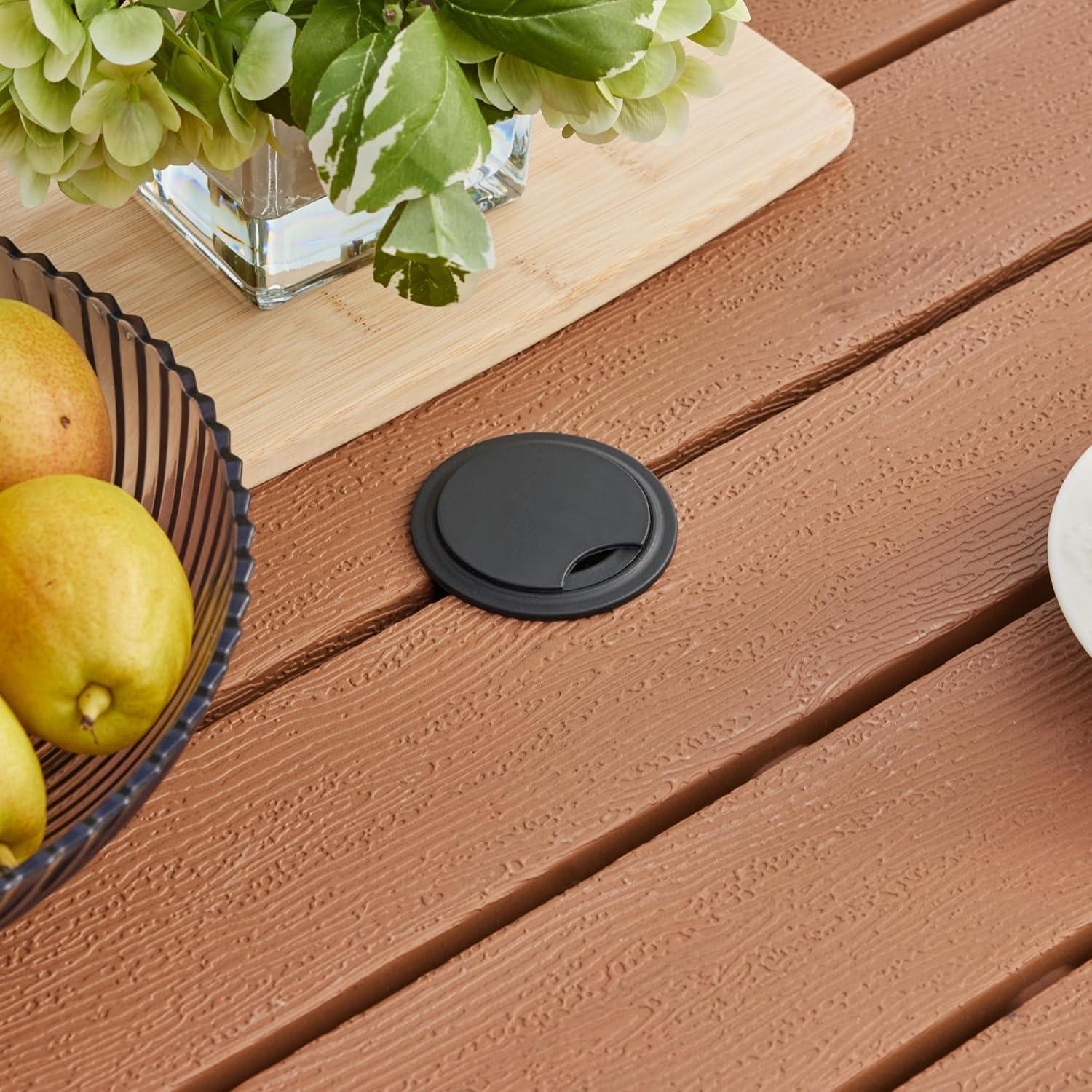 At arm’s reach the walnut tabletop reads as a consistent grain rather than individual wood fibers: the pattern repeats enough that you can tell it’s a finished surface, and the finish has a low sheen that catches highlights without glare. Hold a glass to the surface and you may notice faint water rings or light scuffs that pick up the light as thin lines; tap the top and it gives a slightly hollow, firm sound instead of the muted thud of solid wood. Around the umbrella hole and along the table edge the finish meets the frame with a narrow seam you can feel if you trace it with a fingertip, and under changing light the tiny variations in color and print become more visible—nothing dramatic, just the sort of small inconsistencies that show up after you’ve spent a few minutes up close.