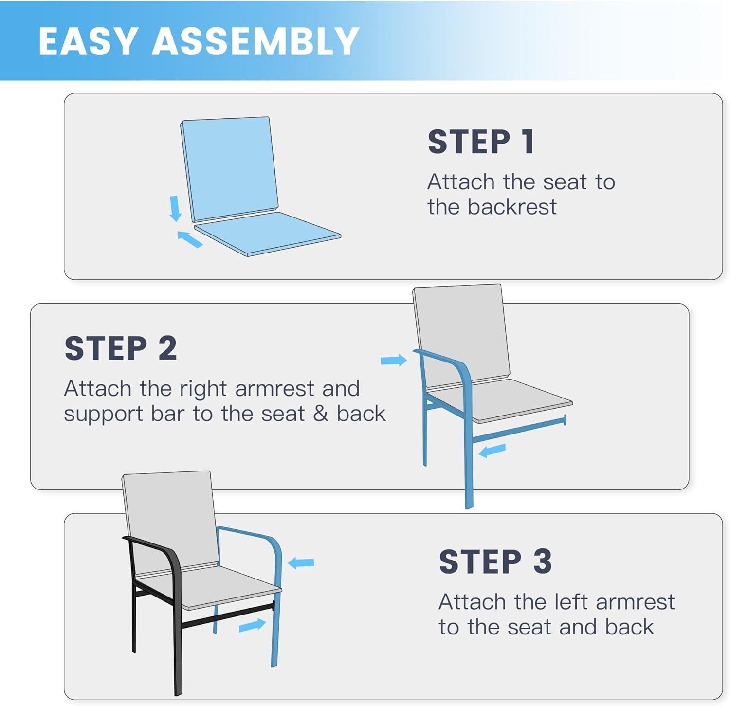 Placed on a patio or balcony, the set’s square table tends to define the immediate dining zone: chairs slide in and out, creating a tidy cluster, and when pushed under the tabletop the circulation path around the group becomes noticeably wider. In tighter layouts the group occupies most of the usable floor area and moving around the table requires short, conscious steps; on a larger deck the same arrangement reads as a contained dining nook.Small gestures—shifting a cushion, angling a chair slightly—are the kind of adjustments that repeatedly happen during use and change how much clearance remains without altering the furniture’s arrangement.