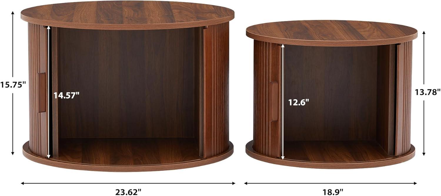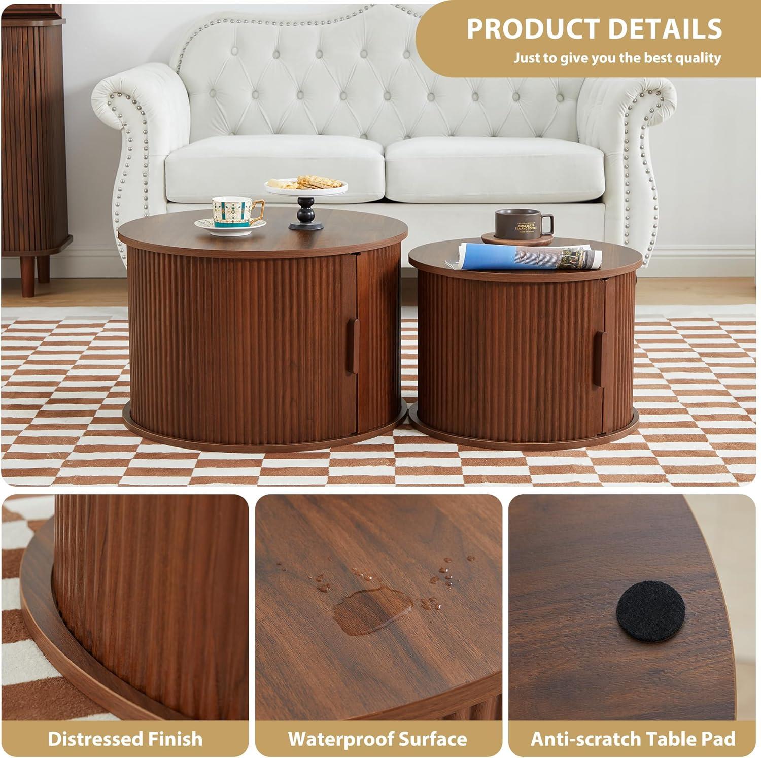 half-hidden under the afternoon light, you notice the smaller table almost melting into the room while the larger circle keeps a calm presence. Noted in the listing as “Coffee Table, Modern Round Coffee Table Set of 2 with Storage Compartment and Sliding Door (Walnut)”, the pair settles low and rounded, its visual weight surprisingly gentle. Run your hand over the fluted sides and the distressed walnut finish: the MDF under your palm feels smooth, the grooves catching the light in thin bands, and the sliding door closes with a muted, reassuring thunk. From the sofa the tops sit around mid-cushion height—enough surface for a tray and a book—its soft edges and compact scale making the set read more like lived-in design than a piece of flatpack furniture.