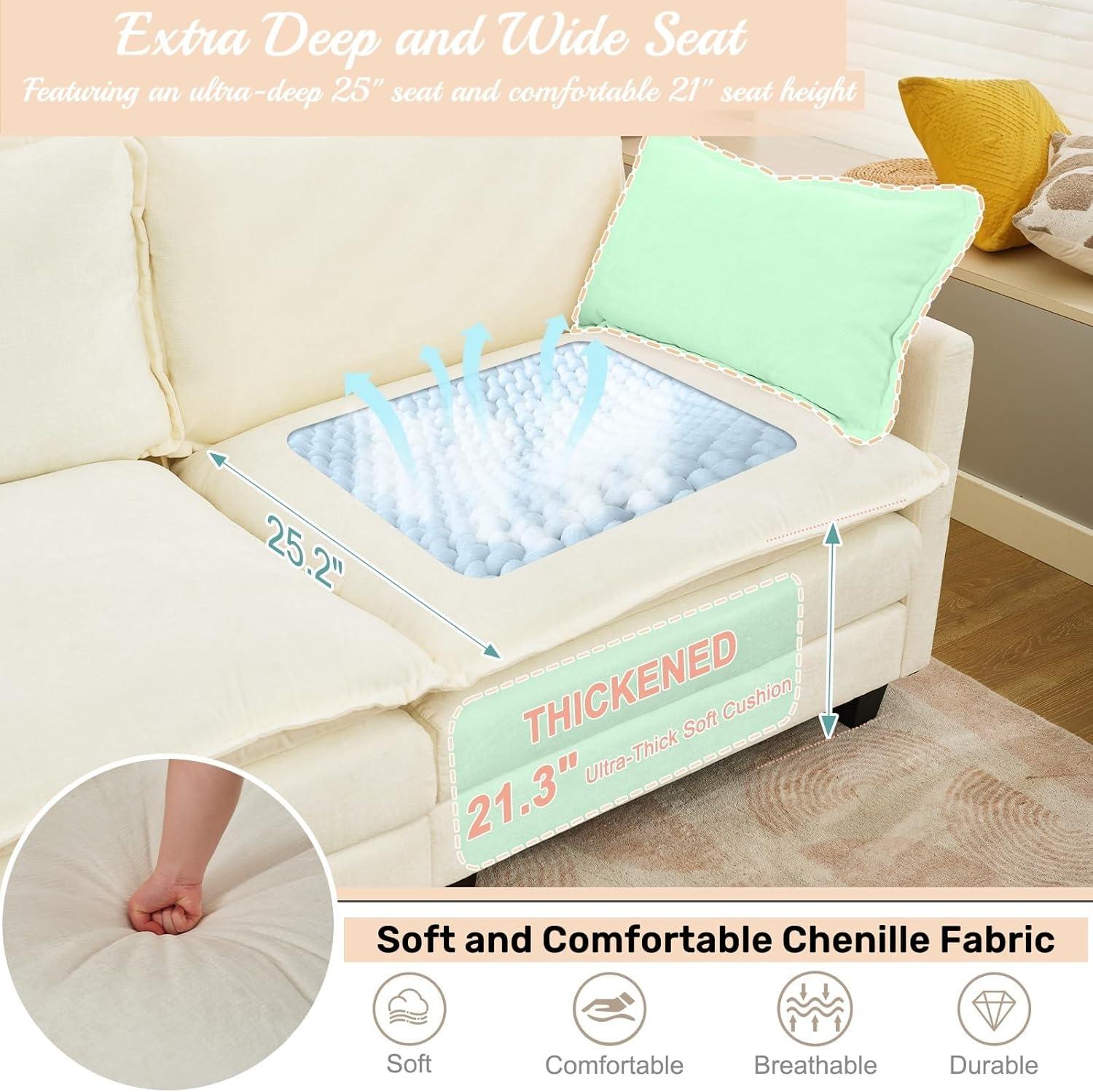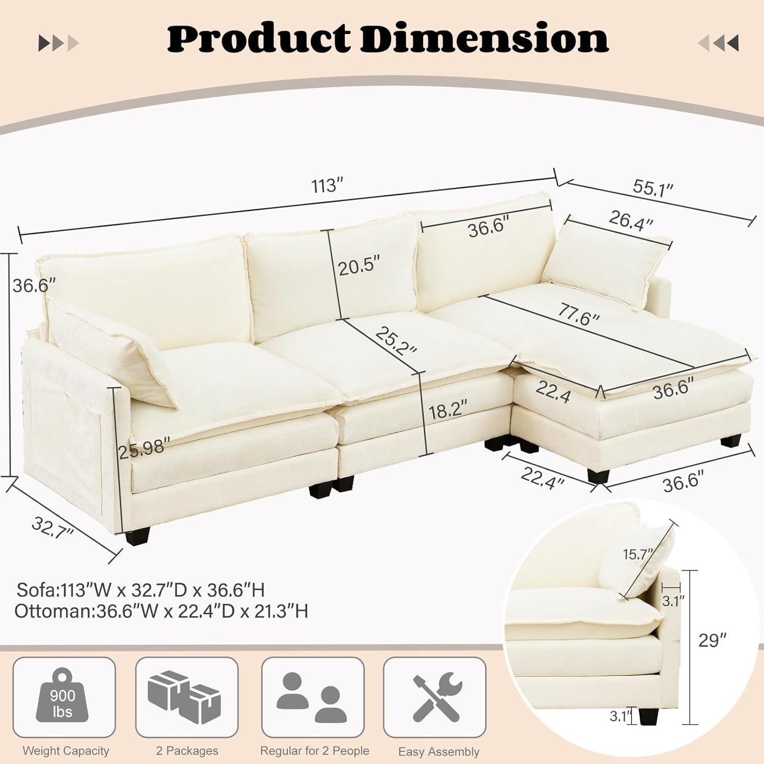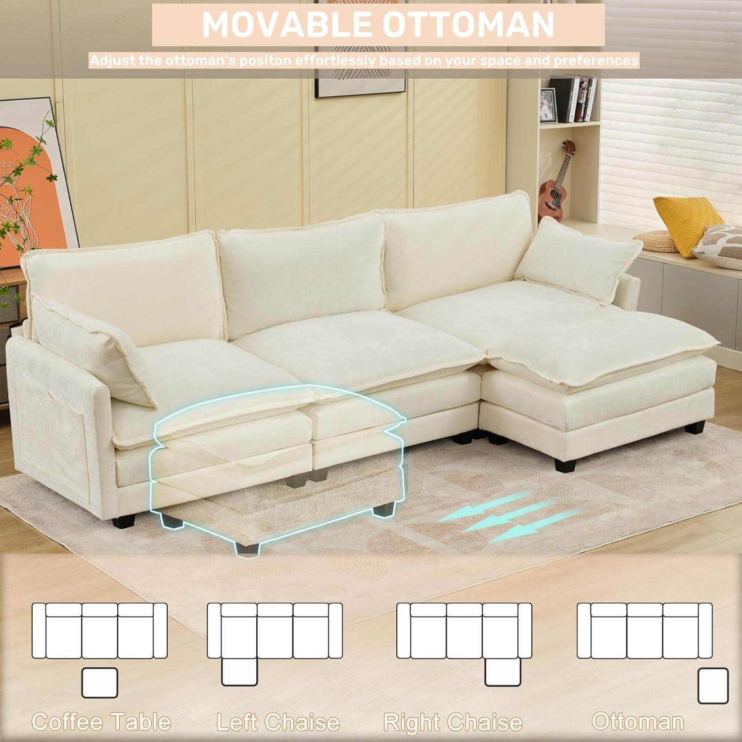 One of the standout qualities of this sectional is how effortlessly it adapts to a variety of living environments. Whether placed in a spacious living room or a snug apartment, its modular design allows us to customize the layout to fit our space perfectly. The cream white upholstery adds a fresh and neutral aesthetic, blending seamlessly with different décor styles without overpowering the room.We appreciate how the ottoman and included pillows expand the functionality, giving us options for extra seating, lounging, or even a makeshift bed-providing a cozy spot for naps or accommodating guests overnight.